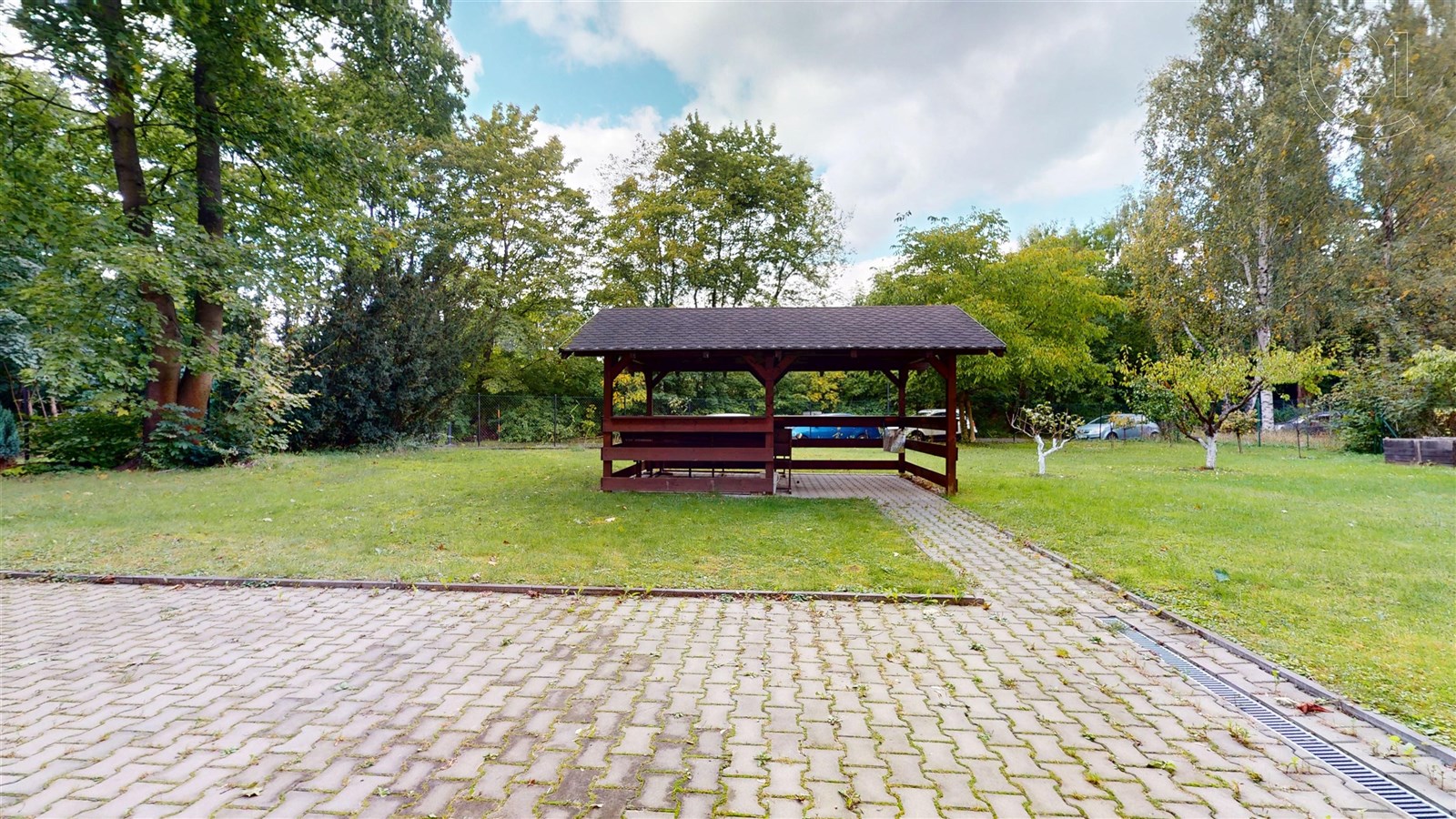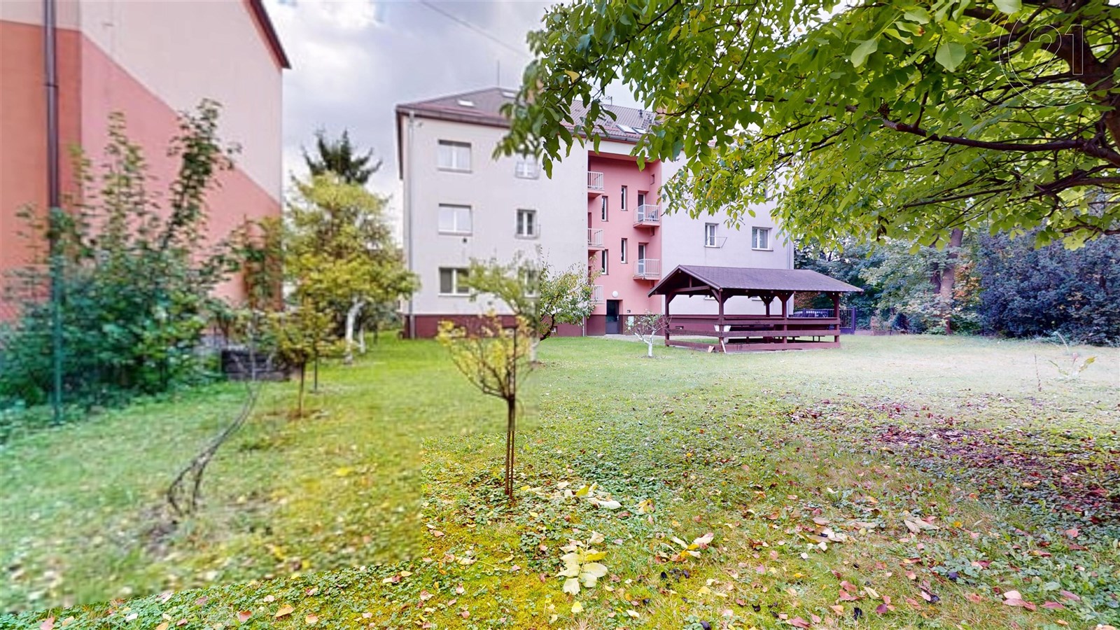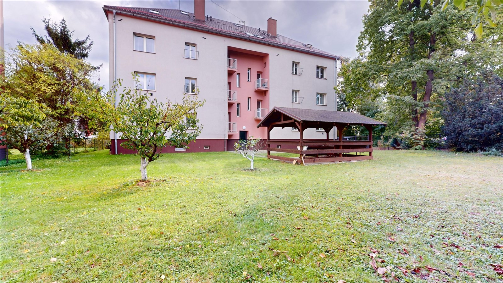Byt se nachází v prvním patře menšího ciglového domu. Je zde oplocená přední i zadní zahrada, o kterou je s láskou pečováno sousedy. Díky tomu je kolem domu zelený trávník, ovocné stromky a dřevěný altánek, kde můžete trávit volné chvíle nebo si jen v klidu vychutnat kávu. Prostředí působí spíše jako bydlení v rodinném domě než v bytě.