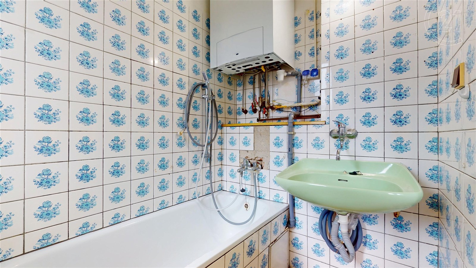 V zadní části kuchyně je vstup do koupelny s vanou a umyvadlem. Koupelna má své vlastní okno a je zde místo na pračku. Pro lepší komfort je zde "žebříkové" topení.