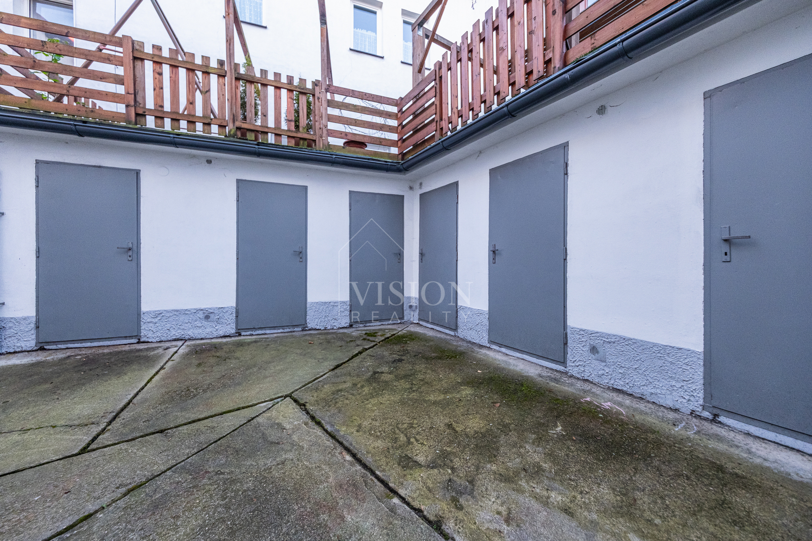 Dispozice bytu zahrnuje kuchyň, prostorný pokoj, koupelnu a oddělené WC. K bytu náleží dvě sklepní kóje a u domu je možnost parkování.