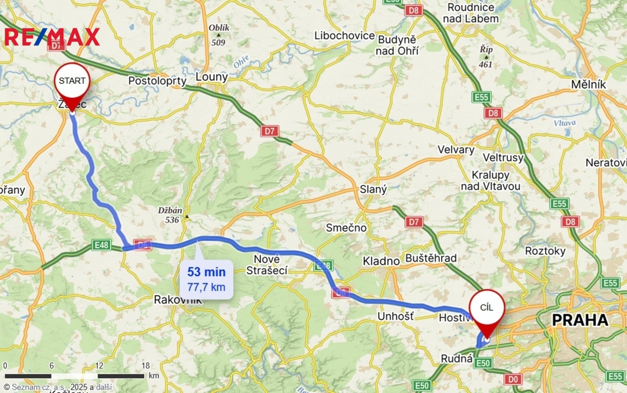 Automobilem se dostanete do západní části Prahy přibližně za 50–55 minut. K rychlosti přispívá nově zprovozněné úseky dálnice D6 (Praha-Karlovy Vary). Nyní probíhá výstavba dalších úseků dálnice D7 (Praha-Chomutov), díky níž se cesta do Prahy v nejbližších letech ještě více zrychlí a zkapacitní. K dispozici je i přímé autobusové spojení do Prahy, obvykle s dojezdem okolo 1 hodiny, často s návazností na stanici metra B – Zličín. Vlakové spojení do Prahy je možné s přestupem (např. v Lužné u Rakovníka).