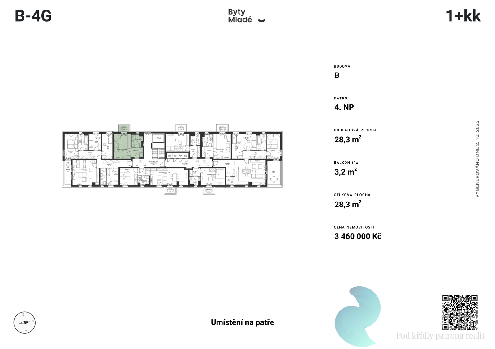 Nabízený byt č. B-4G o dispozici 1+kk, výměře 28,3 m2 a balkonem 3,2 m2, se nachází v prvním patře budovy B. Disponuje vstupní chodbou, koupelnou a obývacím pokojem s kuchyňským koutem.