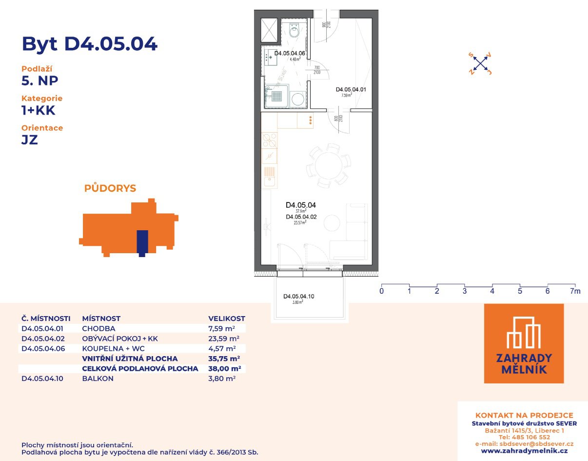 Jedná se o byt 1+kk o velikosti 38 m2 s balkónem o velikosti 3,80 m2. Byt se nachází v 5. nadzemním podlaží moderní novostavby s výtahem.