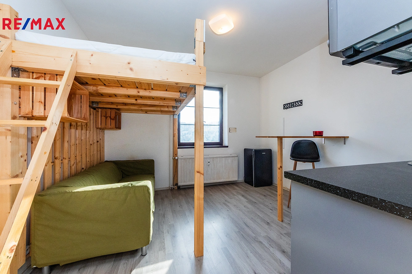 Byt se nachází v 1. patře udržovaného cihlového domu s možností využívání společné zahrady, která nabízí příjemné místo pro odpočinek. K jednotce náleží také sklepní kóje, v domě je k dispozici společná prádelna. Dispozice bytu je ideální pro jednoho člověka či pár – nabízí prakticky řešený obytný prostor s kuchyňským koutem a koupelnou se sprchovým koutem. Díky své poloze je byt vhodný k dlouhodobému i krátkodobému pronájmu – perfektní investiční příležitost, ale také skvělá volba pro vlastní bydlení.
