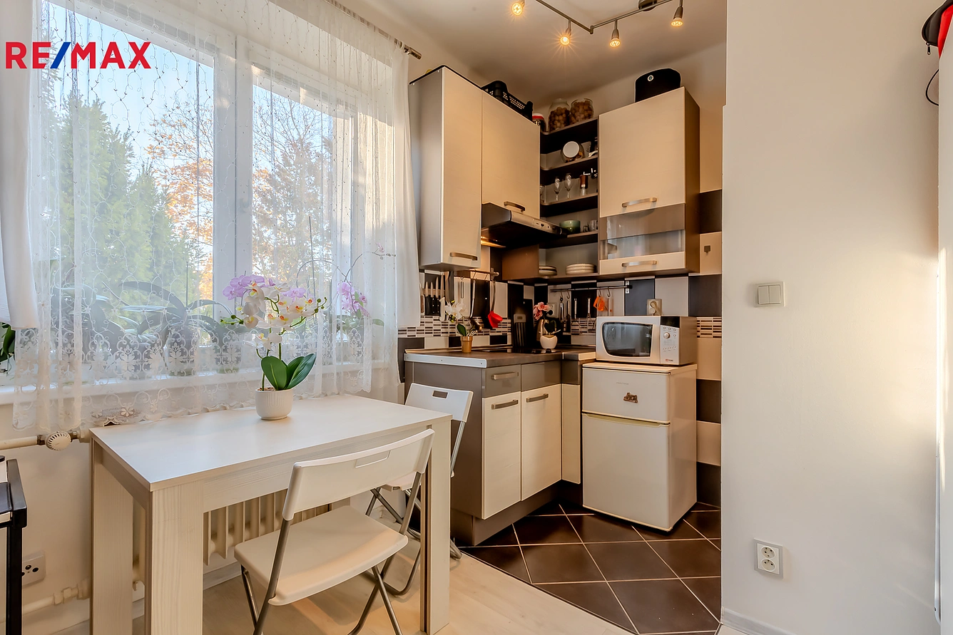 V bytě je obývací pokoj s kuchyňským koutem, předsíňka a koupelna se sprchovým koutem a WC.