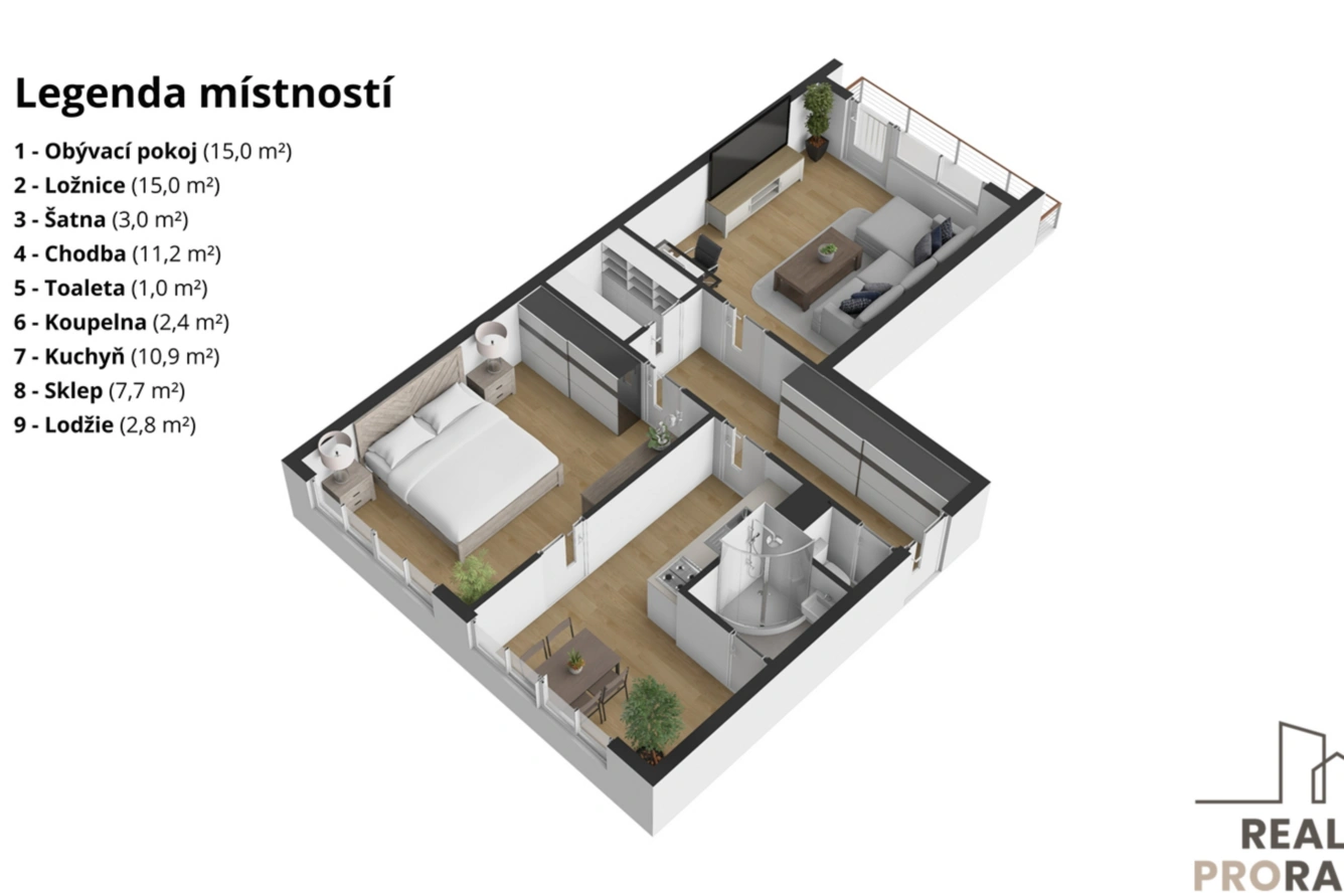 - Obývací pokoj, ložnice, kuchyně, koupelna, samostatná toaleta, šatna a předsíň