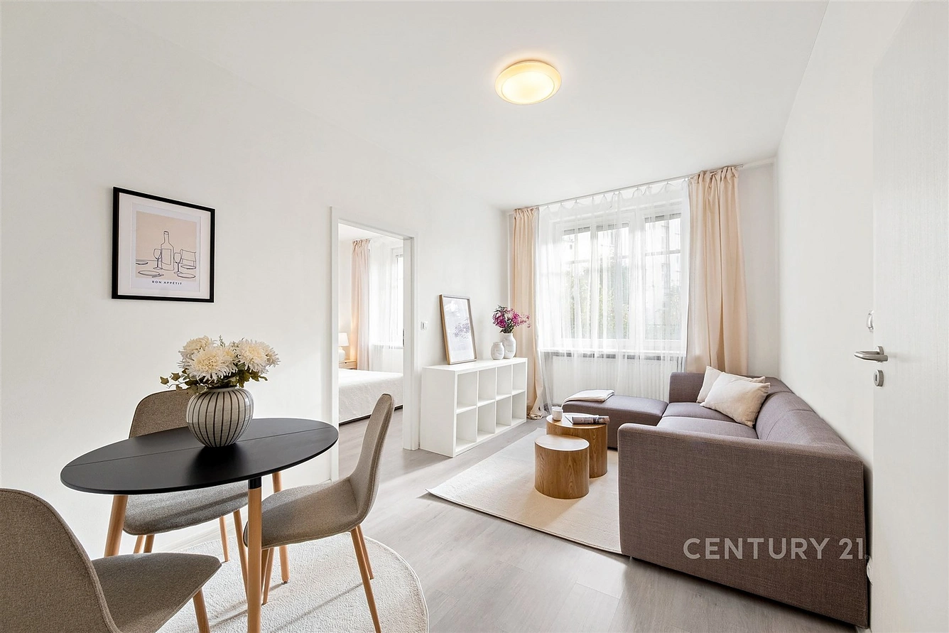 Dispozice nabízí prostorný obývací pokoj s jídelní zónou, samostatnou ložnici orientovanou do klidné části domu a praktickou kuchyni s dostatkem úložného prostoru. Koupelna se sprchovým koutem a samostatná toaleta jsou řešeny tak, aby poskytovaly maximální komfort. Celkový dojem podtrhuje světlý, vzdušný interiér a velká okna.