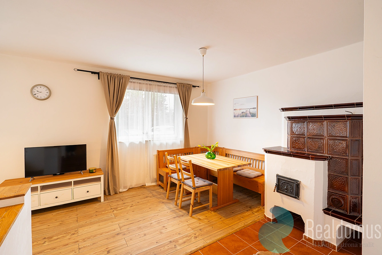 Dispozičně apartmán nabízí plně vybavenou kuchyni, prostorný obývací pokoj s jídelním stolem, manželskou postelí a krásnými kachlovými kamny, samostatnou ložnici, koupelnu se sprchovým koutem a WC a praktickou komoru. Ubytuje pohodlně 4 dospělé osoby.
