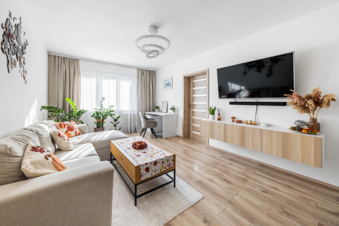 Byt prošel kompletní rekonstrukcí, při níž byly vyměněny všechny vnitřní rozvody a instalace, provedeny nové omítky, položeny podlahy s kvalitními krytinami a osazeny interiérové dveře s obložkovými zárubněmi. Zcela novou podobu získala také koupelna, vybavená designovými obklady, dlažbou a kvalitní sanitou od renomovaných výrobců. Díky zvoleným materiálům a barevnému ladění působí interiér svěže, moderně a útulně.