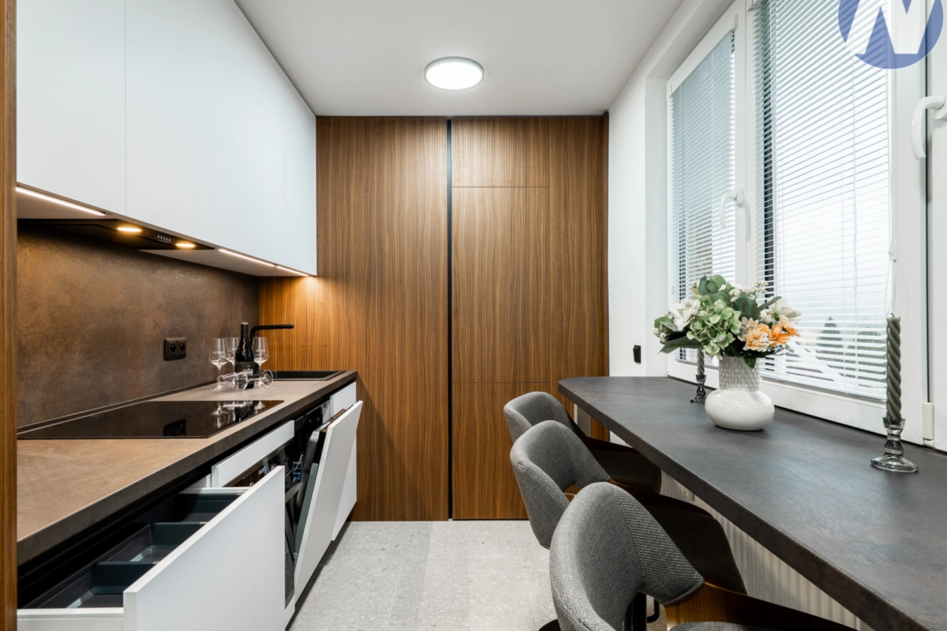 Dominantou bytu je moderní kuchyně od společnosti Sykora, vybavená nadstandardními spotřebiči Electrolux – parní troubou, myčkou, varnou deskou, mikrovlnkou, digestoří i pračkou se sušičkou. Kuchyně je nejen estetická, ale také maximálně funkční.