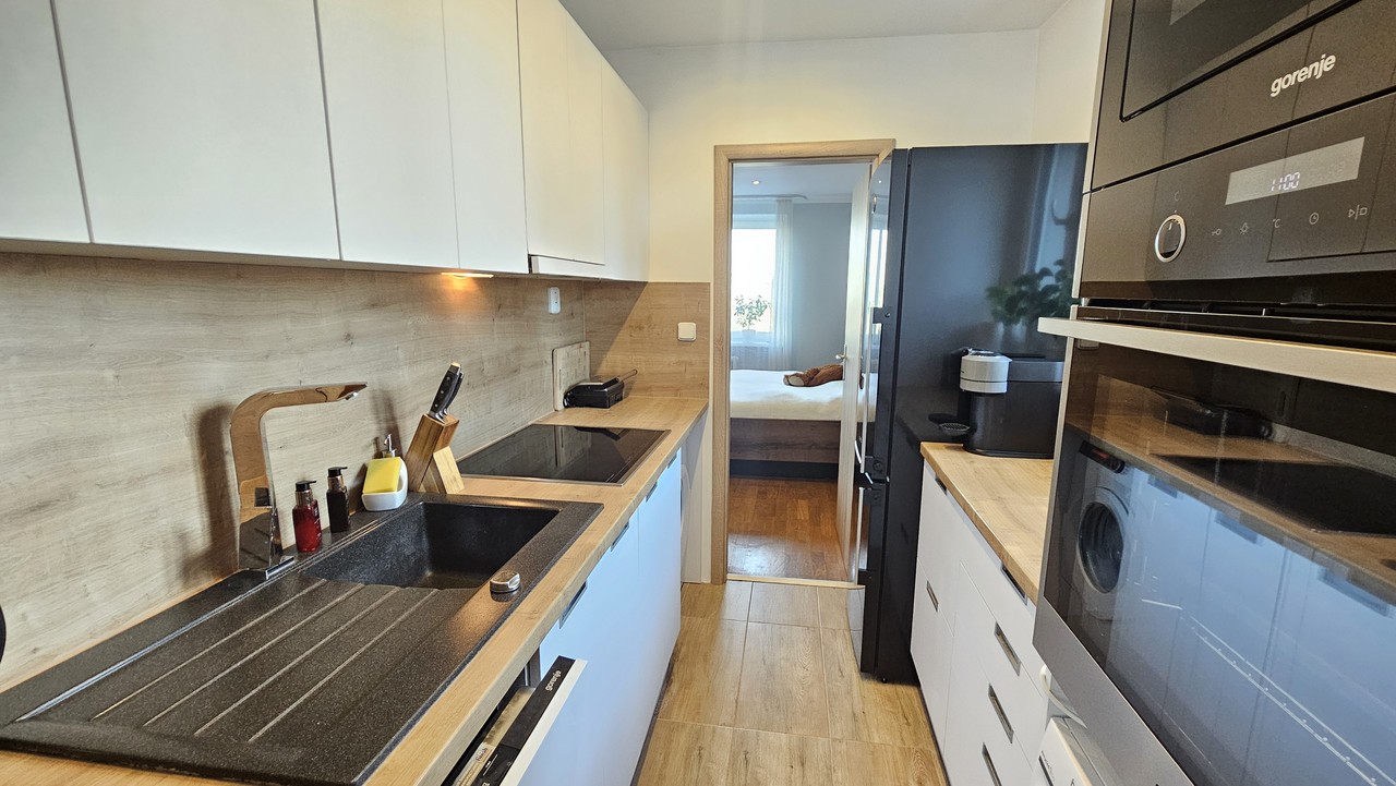 Bytová jednotka je umístěna ve 3. patře modernizovaného, kompletně zatepleného panelového domu z roku 2024 s novým výtahem a přípravou pro venkovní žaluzie. Dům i samotná jednotka splňují vysoké nároky na současné bydlení, a to jak po technické, tak estetické stránce. Byt prošel v roce 2018 perfektní, koncepční a do detailu promyšlenou rekonstrukcí podle představ paní majitelky, při které kladla důraz na maximální efektivitu prostoru, dostatek úložných míst a praktické využití každého centimetru. Nejde o běžnou rekonstrukci – toto je byt, kde vše navazuje, dává smysl a působí esteticky i funkčně. O Obývacím pokoji se dá s nadsázkou říci že je multifunkční srdce domácnosti. Dominantou pokoje je kvalitně řešená sklápěcí postel integrovaná v nábytkové stěně, která umožňuje okamžitou proměnu obývací zóny v plnohodnotnou ložnici. Alternativou je pohodlný rozkládací gauč. Pod televizí se nachází další chytře skrytá úložná místa. Celý prostor působí harmonicky, vzdušně a nabízí vysokou variabilitu. Vedle pokoje se nachází designová kuchyň s maximálním vybavením. Kuchyňská linka je naprosto nadstandardní – komínová stěna s vestavnou troubou a mikrovlnkou, myčka nádobí, pračka se sušičkou, promyšlené rozvržení skříněk a důmyslné členění úložných prostor. Kuchyň je navržena tak, aby byla nejen krásná, ale především extrémně praktická pro každodenní život. Koupelna působí moderním, čistým dojmem. Nabízí sprchový kout, elegantní umyvadlo a podsvícené designové zrcadlo. Toaleta je samostatná, což ještě zvyšuje komfort. Druhá obytná místnost slouží v současnosti jako dětský pokoj. Díky své dispozici nabízí příjemné světlo a dostatek prostoru pro postel, úložné části i pracovní koutek. Další přednosti bytu - okna na tři světové strany, tímto je byt po celý den nádherně prosvětlený, velká vestavěná skříň v chodbě. Tento byt vás okouzlí elegantními detaily, kvalitními materiály a nadčasovým řešením.SHRNUTÍ: Tento byt je ideální pro náročné zájemce, kteří hledají nadstandardní, designově dotažené a dokonale funkční bydlení bez nutnosti jakýchkoliv dalších investic. Každý prvek zde byl paní majitelkou pečlivě promyšlen, aby celek působil moderně, esteticky a zároveň maximálně prakticky. Pokud vás byt zaujal rádi vás přivítáme na prohlídce.