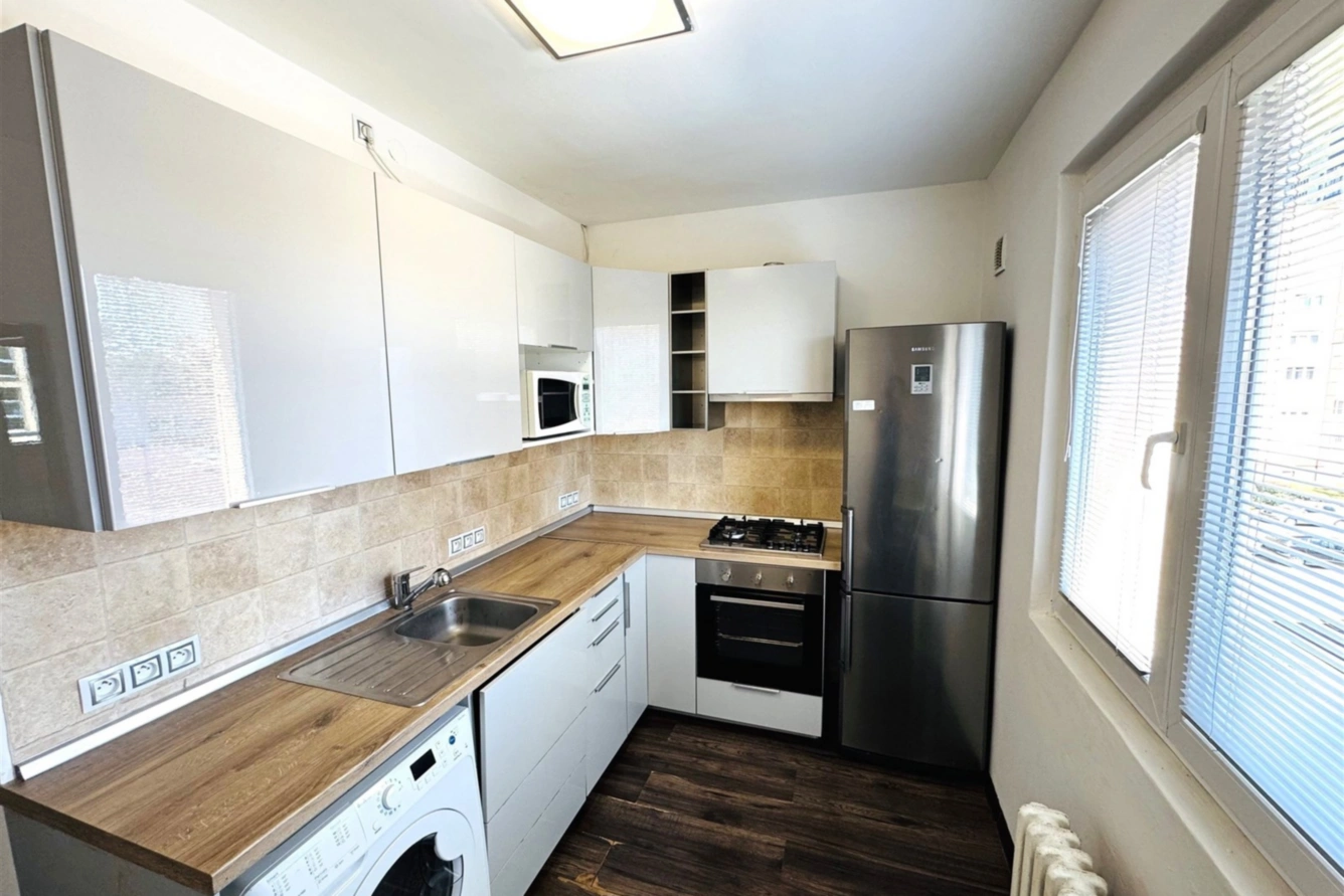 Jedná se konkrétně o částečně vybavený byt o dispozici 2+1 a podlahové výměře 56 m2 (výměra zahrnuje lodžii a sklep), který se nachází ve druhém patře zrekonstruovaného panelového domu.