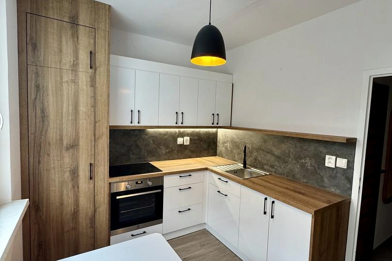 Byt prošel zdařilou rekonstrukcí - nová kuchyňská linka vyrobená na míru truhlářem včetně vestavných spotřebičů, nové podlahy, dveře a moderní koupelna. Díky praktickému dispozičnímu řešení nabízí byt dostatek prostoru pro pohodlné bydlení jak pro jednotlivce, tak pro pár. K bytu náleží balkon s příjemným výhledem do okolí a také sklepní kóje. Dům je udržovaný, v dobrém technickém stavu a s nízkými provozními náklady. Parkování je možné přímo u domu.