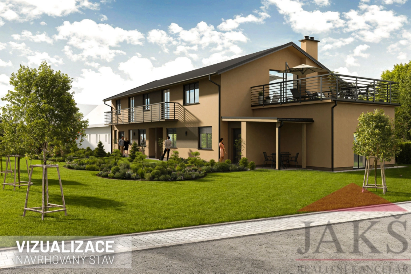 Apartmán/byt č. 1 o dispozici 2+kk s terasou, skladem a parkovacím místem na oploceném pozemku s komunitní zahradou se skleníkem, trampolínou a posezením.