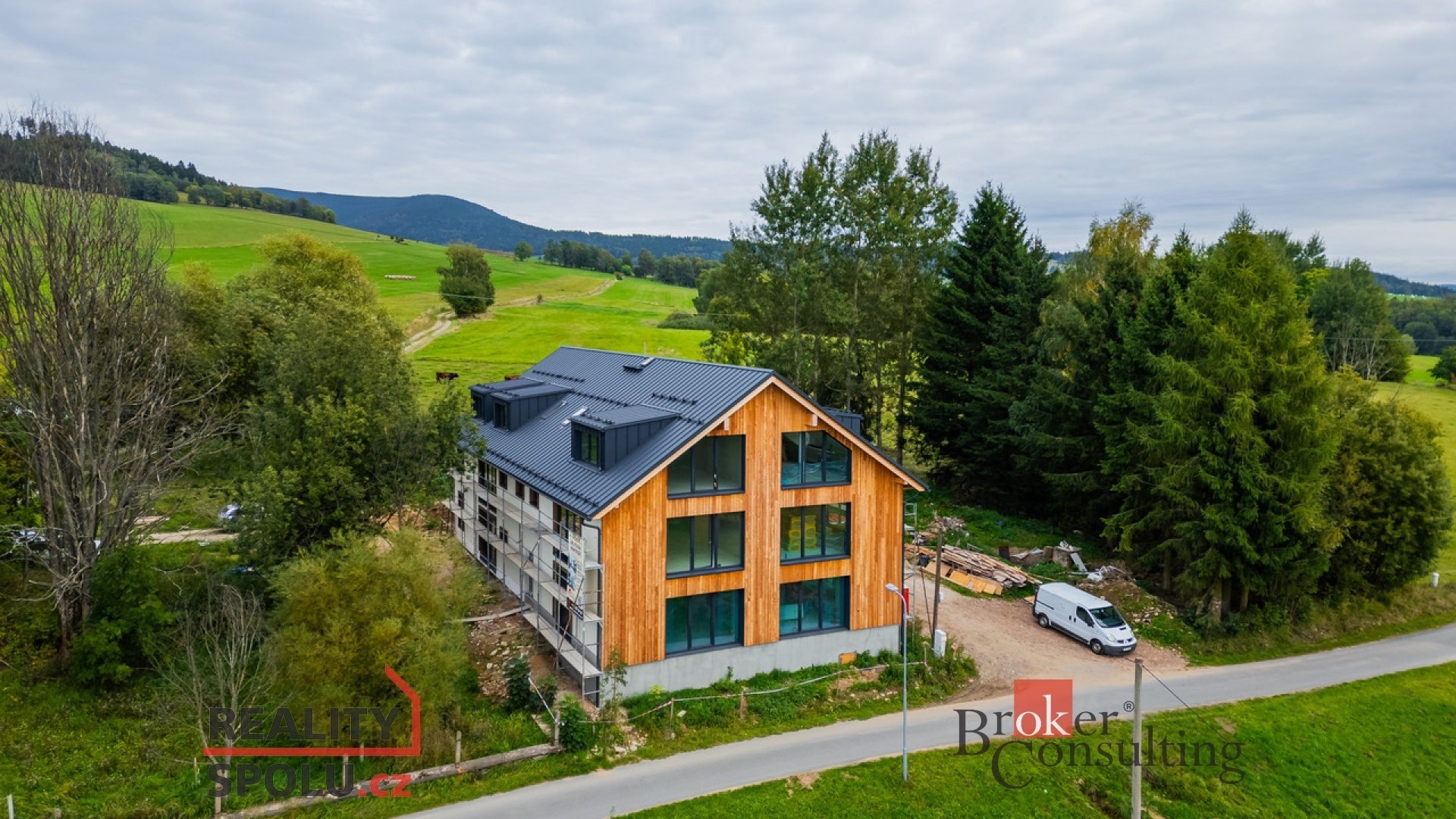 Nabízíme ke koupi moderní apartmán 2+kk o podlahové ploše 59,94 m2, který vyniká praktickým uspořádáním, světlým interiérem a atraktivní orientací na jih s výhledem na Stezku v oblacích a přilehlé zázemí.Apartmán disponuje útulnou samostatnou ložnicí, která poskytuje soukromí a dostatek prostoru pro manželskou postel i úložná řešení. Dominantou bytu je prostorný obývací pokoj s kuchyňským koutem, do kterého proudí maximum denního světla díky velkoformátovým proskleným oknům. Ta propojují interiér s okolní krajinou a dodávají prostoru vzdušnost a otevřenost.Obývací část umožňuje pohodlné umístění sedací soupravy, jídelního stolu a kuchyňské linky dle vlastního výběru. Koupelna je navržena v kompletním standardu – se sprchovým koutem, umyvadlem a toaletou.Jižní orientace zajišťuje sluneční paprsky po celý den, což činí apartmán mimořádně příjemným k užívání. V ceně je zahrnuto vlastní parkovací stání a sklepní kóje pro maximální komfort.Apartmán bude připraven k nastěhování v létě tohoto roku. Zajistíme Vám i výhodné financování na míru.Ideální volba pro rekreační bydlení nebo investici v jedné z nejatraktivnějších horských lokalit s celoročním využitím.