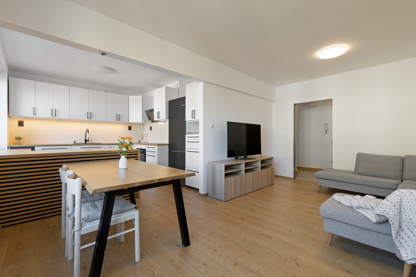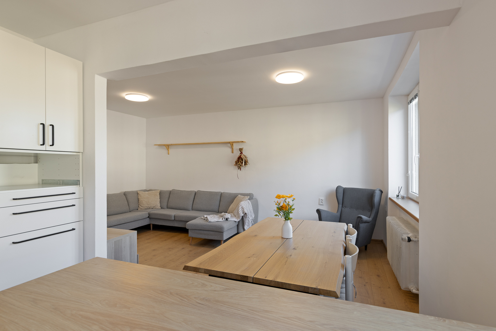 - vybourání příček a propojení kuchyně s obývacím pokojem,