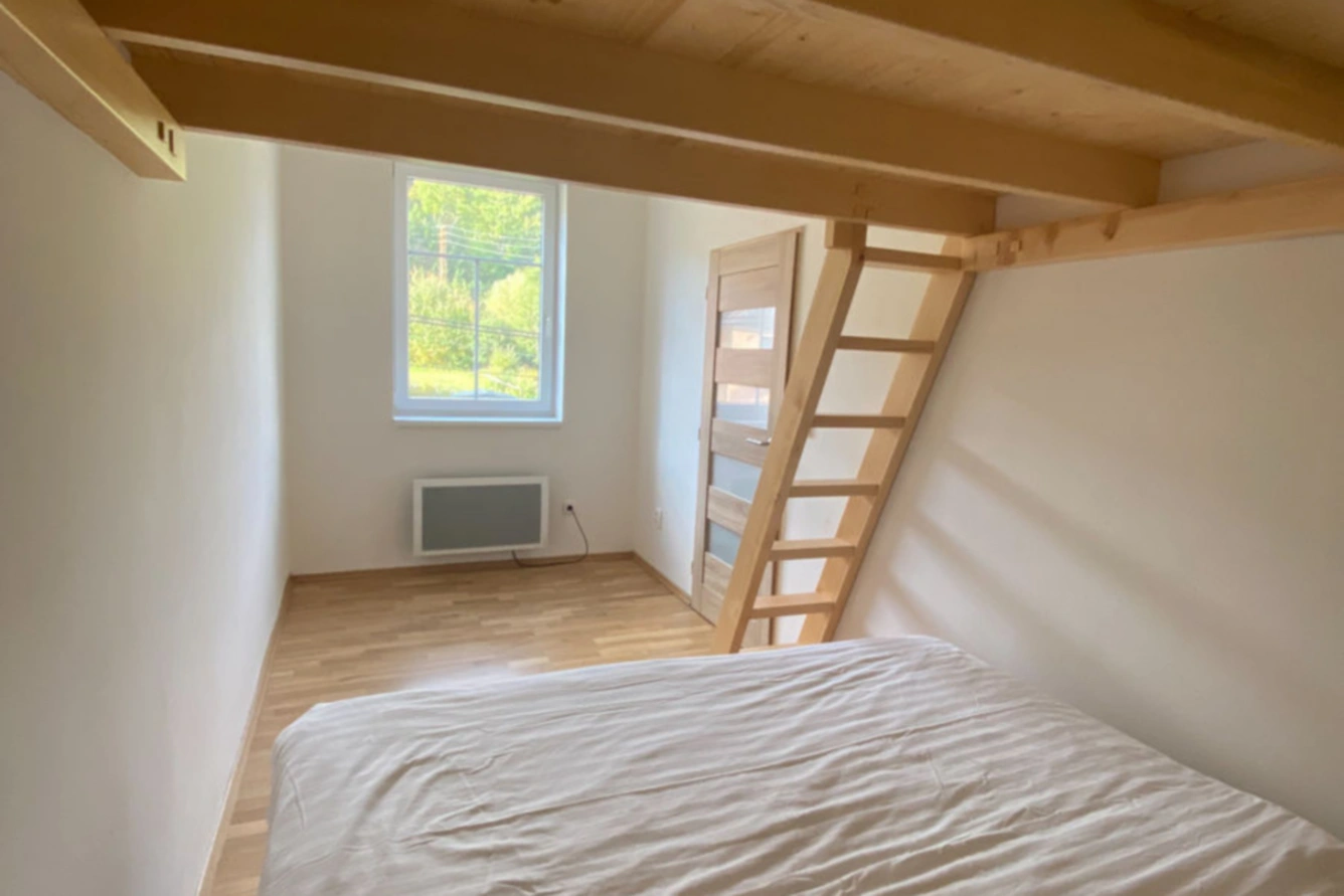 Součástí bytu je nová kuchyňská linka se spotřebiči (lednice zn. ZANUSSI, trouba, sklokeramická deska), patrová postel, stůl, židle, skříně atd., vše je v ceně bytu. Nová koupelna se sprchovým koutem a samostatné WC, el. žebřinové topení, dlažba. Obývací pokoj propojený s kuchyňským koutem, vše útulně a nově zařízeno. Pokoj na spaní má na míru postavenou postel se schody a tím se vytvořilo místo pro dalši spaní dole pod ní – počet míst na spaní až šest 2-2-2. Parkovací stání je před domem na společném pozemku, který je k domu. V domě není žádná místnost na lyže ani sklepy - ve výstavbě.