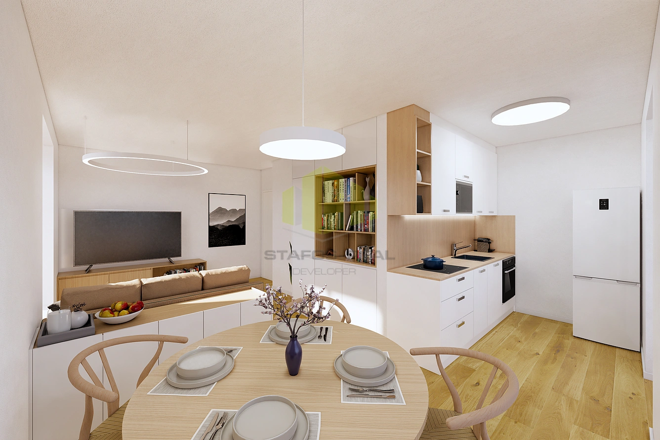 Světlý a moderně řešený byt 2+kk s balkonem v projektu Rezidence Mánesova v Lipníku nad Bečvou představuje ideální volbu pro páry, mladé rodiny nebo investory. Byt je vybaven vinylovými podlahami, teplovodním podlahovým vytápěním, kuchyňskou linkou v ceně bytu, přípravou pro venkovní žaluzie a u bytů ve 4.–6. NP také přípravou na klimatizaci. Interiérové prvky je možné zvolit ve světlé (2NP, 4NP, 6NP) nebo tmavé variantě (3NP, 5NP).
