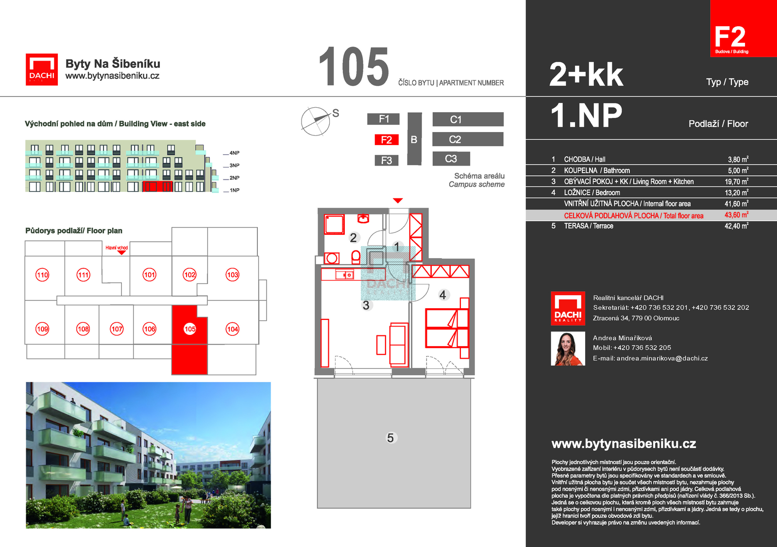 Navazujeme na úspěch první etapy a přinášíme vám jedinečnou příležitost pořídit si nový domov v atraktivním projektu Byty Na Šibeníku. DACHI, prodejce a partner developera, vám v rámci druhé etapy nabízí ke koupi byt 2+kk (č. 105) o ploše 43,6 m² s terasou o velikosti 42,4 m². Byt se nachází v 1. nadzemním podlaží bytového domu F2, který je součástí šestipodlažního objektu se čtyřmi nadzemními a dvěma podzemními podlažími.