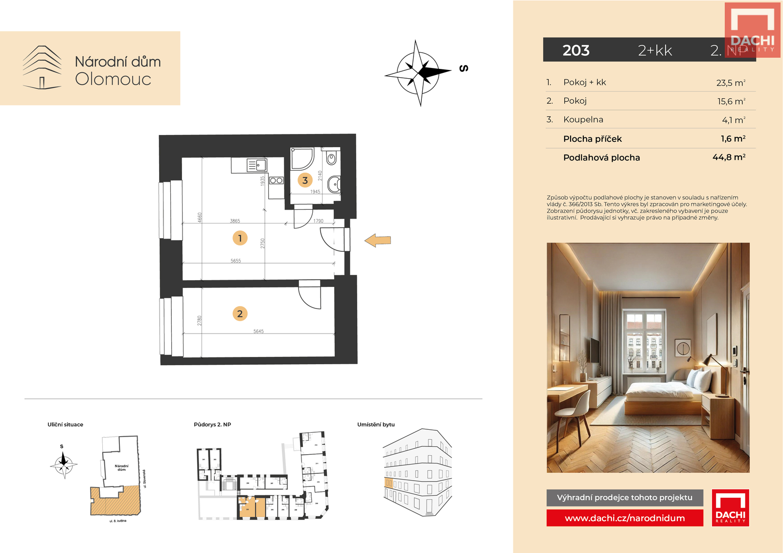 V rámci projektu nabízíme byt č. 203 o dispozici 2+kk s podlahovou plochou 44,8 m², který se nachází ve 2. nadzemním podlaží.