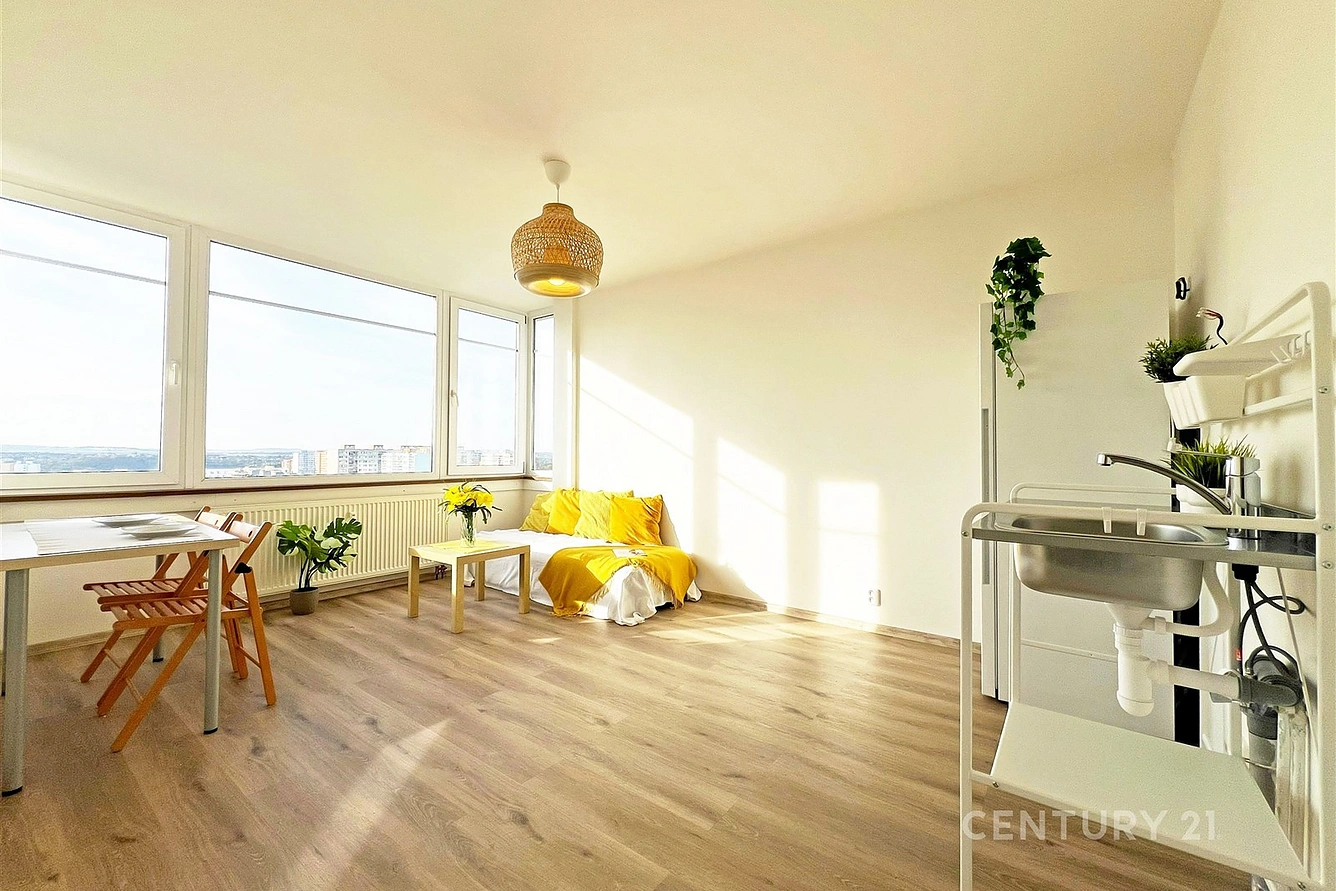 Ve výhradním zastoupení nabízíme k prodeji slunný byt 2+kk v osobním vlastnictví po rekonstrukci o podlahové ploše 32,7 m2 + 2,3 m2 sklepní kóje, umístěný v 9. patře (10.NP) budovy v Praze 8 – Troja, ulice Olštýnská. Byt, který prošel rekonstrukcí, se skládá z předsíně, koupelny se sprchovým koutem a přípojkou pro pračku, samostatného WC, ložnice (8,7 m2), a obývacího pokoje s kk (16,3 m2) s přípravou pro osazení kuchyňské linky dle vlastních představ. V současné době je zde osazena základní kuchyňka a nová lednice s mrazákem Bosch. Podlahové krytiny tvoří vinylová podlaha a keramická dlažba. Z bytu je krásný výhled na západ Prahy a její okolí. Součástí prodeje je i nebytový prostor – sklepní kóje o výměře 2,3 m2. Revitalizovaný dům je vybaven vstupní recepcí a 4 výtahy.