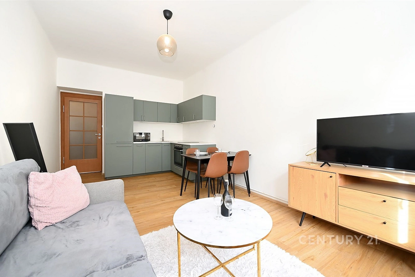 Za vstupními dveřmi do bytu je prostorná chodba se skříněmi (v jedné z nich je botník), vstupem do komory, na samostatné WC, do koupelny se sprchou a pračkou, do ložnice a do obývacího pokoje s kuchyní. Ložnice je orientovaná do vnitrobloku, takže je krásně tichá, součástí je i menší šatna. Kuchyň je plně vybavená, má vestavěnou lednici s mrazákem, myčku nádobí, troubu, indukční dvouplotýnku. V obývací části je sedačka, TV stolek, stůl a 4 židle. Vše je moderní a plně funkční. Vytápění je řešené lokálně WAW (vafkami), je možné vyměnit za kondenzační plynový kotel. Ohřev vody je bojlerem na noční proud.