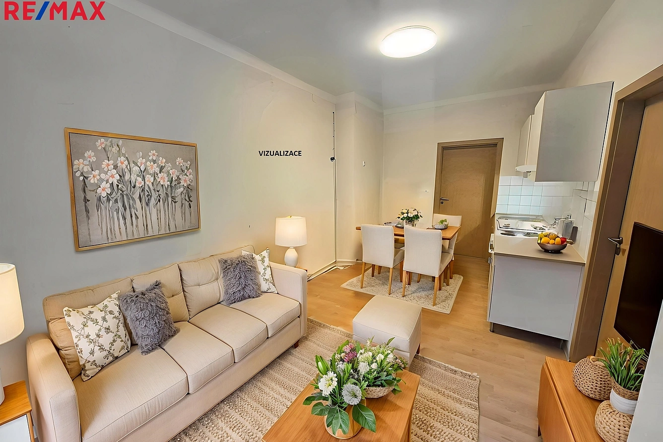 Vstupní předsíň (cca 7 m²) poskytuje dostatek úložného prostoru a přístup do koupelny, samostatného WC a komory. Z předsíně se vstupuje do obývacího pokoje s kuchyňským koutem (cca 15 m²), na který navazuje prostorná ložnice (cca 21 m²). Nadčasový charakter bytu umocňuje výška stropů 2,8 m. Vizualizace obývacího pokoje a ložnice je pouze ilustrativní.