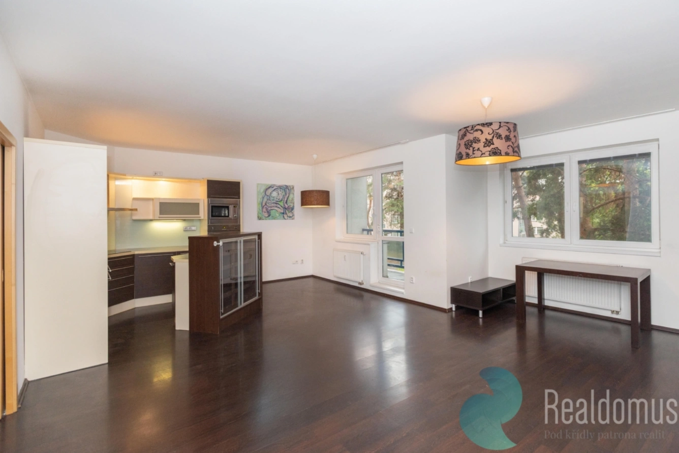 Byt disponuje chodbou v které je umístěna vestavná skříň s pračkou. Samostatná ložnice s velkou šatnou a balkonem. Obývací pokoj s plně vybavenou kuchyňskou linkou na míru, i s vinotékou. Z prostorné lodžie je krásný výhled do společné uzavřené zahrady, kde můžete trávit chvíle nejen u grilování, ale i sklenky vína. Z ložnice je možné vyjít na balkon, který nabízí také výhled do zahrady. Koupelna je s rohovou vanou. Samostatné WC. K bytu náleží parkovací místo v garáži, která je ovládaná automatickými vraty. Velmi prostorný sklep se velice hodí jako úložný prostor.