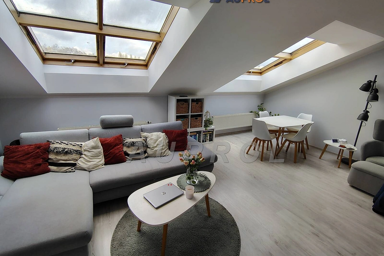 INTERIÉR – krásný světlý prostorný podkrovní byt zakoupený od developera 2013, udržovaný, nepoškozený, není potřeba žádné rekonstrukce - vše je nové a plně funkční ( novostavba ) vč. nových rozvodů el. a vody, orientace SV/JZ, střešní okna s kvalitním těsněním, plovoucí podlahy a dlažba, v bytě je klimatizace, předsíň – samost. WC s umyvadlem, plynový kotel a el. bojler, vestav. skříně na míru s prostorem na pračku, kuch. kout – sklokeram. deska, trouba, myčka, lednice s mrazákem, velký obývák 32 m2, ložnice s vestav. skříní ústí do koupelny s vanou a WC, předsíň vede k balkonu s pěkným výhledem na historické střechy města
