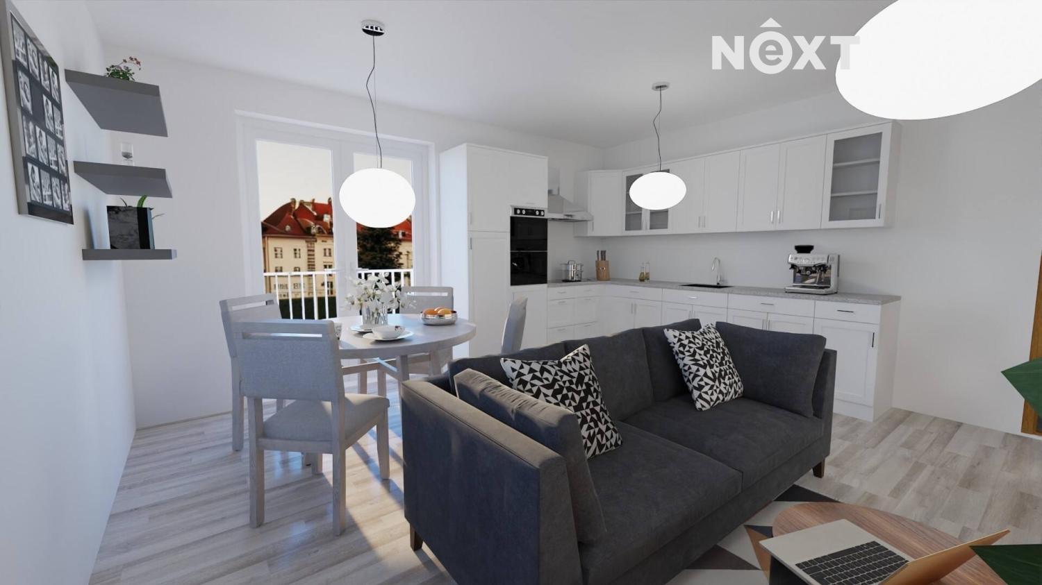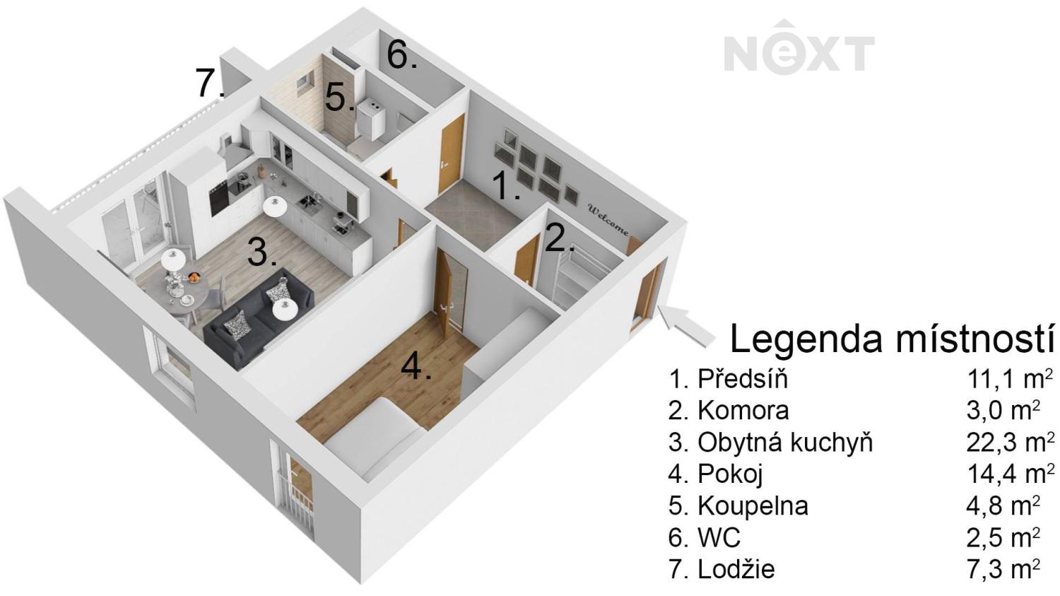 V bytě je dispozici prostorná předsíň (11,1 m2), ze které jsou vstupy do jednotlivých místností - do ložnice (14,4 m2) a do obytné kuchyně (22,3 m2), která současným majitelům slouží jako velmi prakticky jednoduše zařízená kuchyň, ale ve skutečnosti se zde nachází dost prostoru nejen pro kuchyňský kout s jídelním stolem, ale i dost místa pro vytvoření obývací části s pohodlnou pohovkou a konferenčním stolkem. Ranní kávu si za teplých dní můžete vychutnat v lodžii (7,3 m2) navazující přes PSK portál přímo na tento obytný prostor. PSK portál stejně jako všechna okna v bytě má trojsklo. Z chodby je dále vstup do koupelny (4,8 m2) s umyvadlem a vanou, na samostatné WC (2,5 m2) a do komory ( 3 m2).