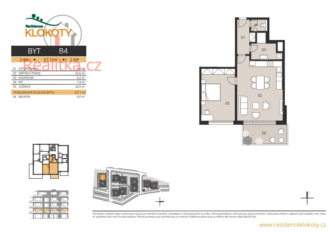 V exkluzivním projektu Rezidence Klokoty nabízíme byt B4, nacházejícím se v 2. NP o dispozici 2+kk o výměře 67,1 m2 a balkonem 9 m2. Byt je tvořen vstupní halou, obývacím pokojem a koupelnou s WC. K bytu náleží sklep 4 m2.