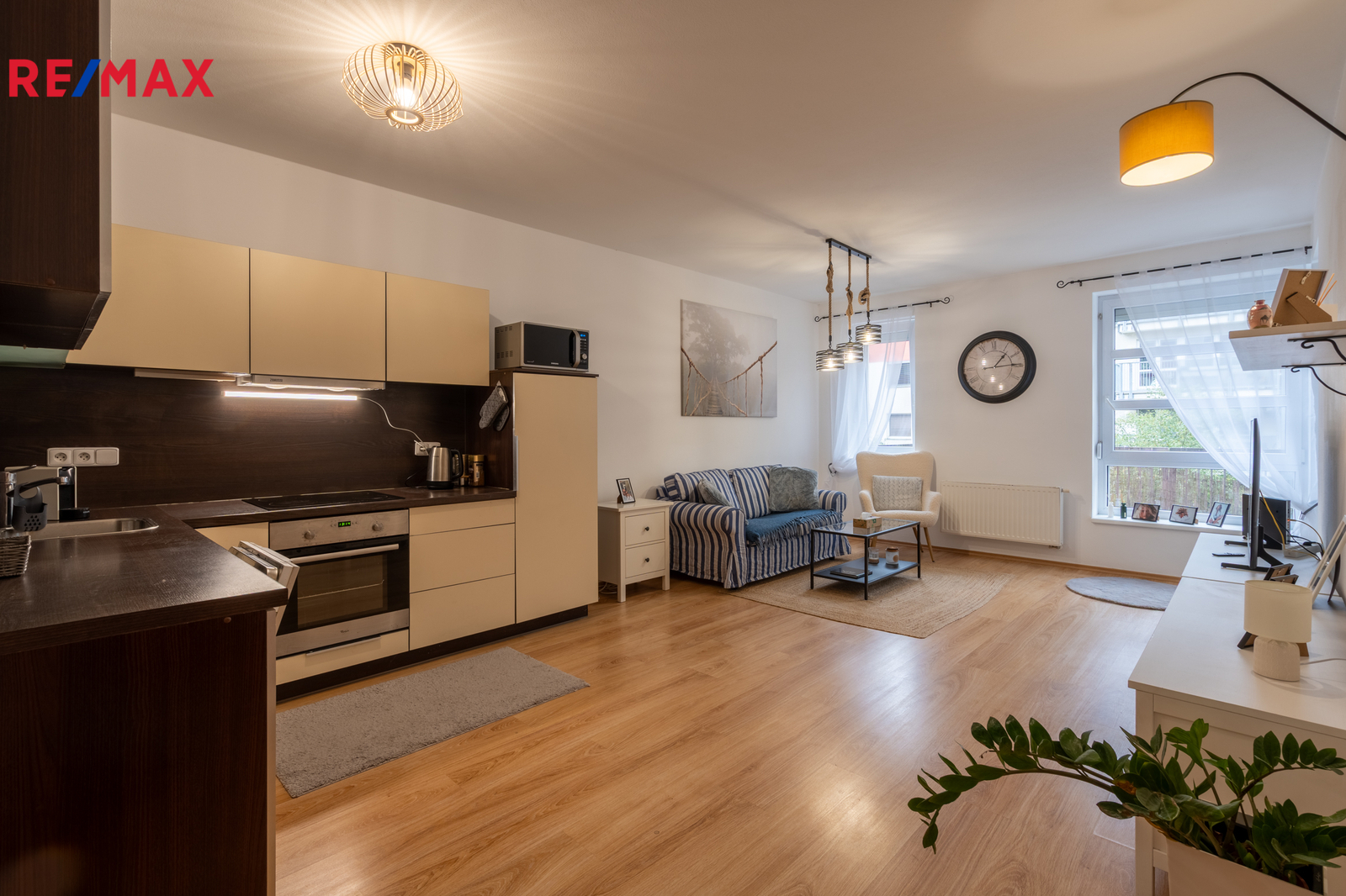 slunný obývací pokoj s kuchyňským koutem a vstupem na terasu,