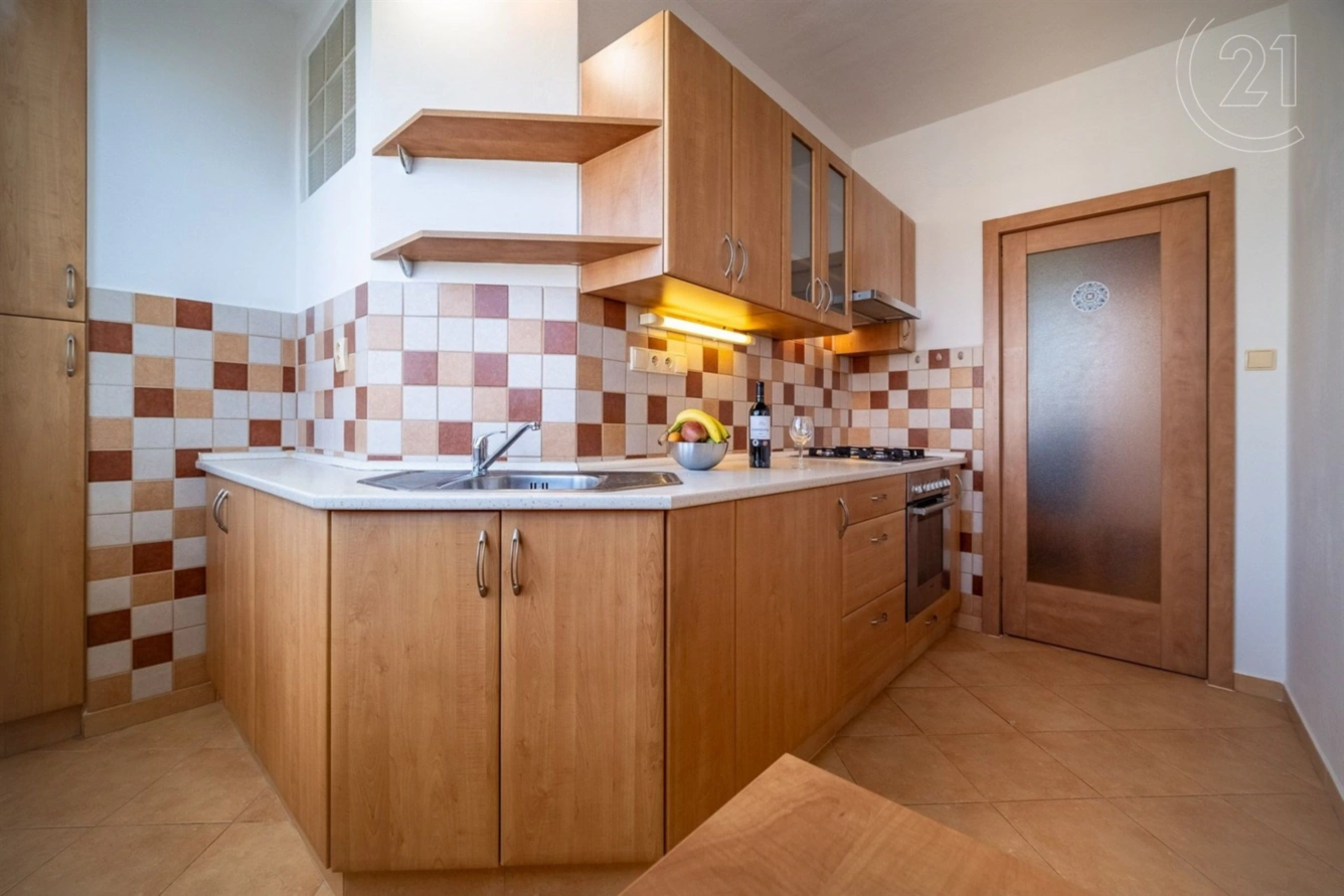 Byt se nachází v osmém patře bytového domu s výtahem a jeho dispozice je řešena takto: součástí prostorné vstupní chodby (6,32 m2) je praktická šatna (1,82 m2) s policovým systémem. Z chodby je přístupný pokoj (12,25 m2), koupelna a kuchyně. Koupelna (2,72 m2) je vybavena sprchovým koutem, umyvadlem, toaletou a přípojkou pro pračku. Součástí kuchyně (8,30 m2) je kuchyňská linka a jídelní kout. Z chodby dále vstupujeme do prostorného obývacího pokoje (16,30 m2). Ložnice (16,30 m2) je přístupna z obývacího pokoje, se kterým je propojena dvoukřídlými dveřmi. V obytných místnostech najdete parketovou podlahu a v ostatních místnostech keramickou dlažbu.