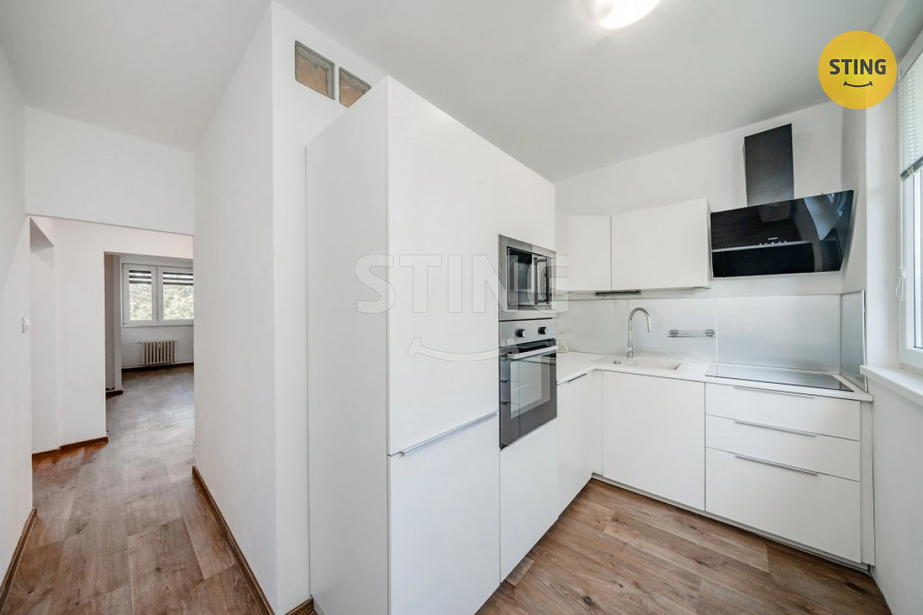 Dispozice bytu nabízí pohodlné bydlení pro rodinu i pár – tři samostatné pokoje, plně vybavená kuchyně a praktické úložné prostory.