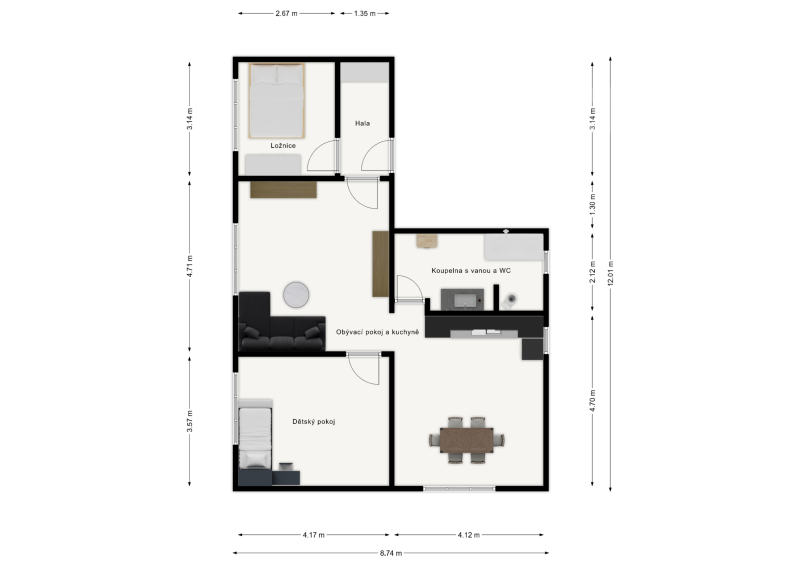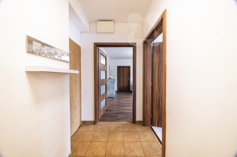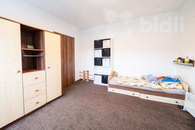 Byt o podlahové ploše 75 m2 je prostorný a zároveň velmi prakticky řešený. Dominantou je velký obývací pokoj, dále zde najdete ložnici, dětský pokoj, prostornou kuchyň a koupelnu s vanou a WC. Příjemným bonusem je vzdušná vstupní hala, která nabízí dostatek místa pro úložné prostory. K bytu navíc patří tři prostorné sklepy o celkové ploše 18 m2