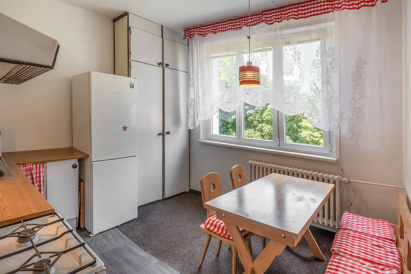 K bytu náleží prostorná sklepní kóje. Vše je možné ponechat v původním stylu a ihned užívat bez nutnosti úprav pro milovníky retra či investovat do renovace dle vlastních představ. V celém bytě jsou plastová okna. Vytápění a ohřev vody jsou řešeny dálkovým rozvodem. Dům po kompletní rekonstrukci včetně výtahu, je umístěn v zeleni, jedná se o naprosto tiché místo s dobrou dostupností MHD, obchodů, škol a školek, v docházkové vzdálenosti naleznete volnočasový areál Rolava, ikonickou hospůdku Severka a v centru jste za pár minut.