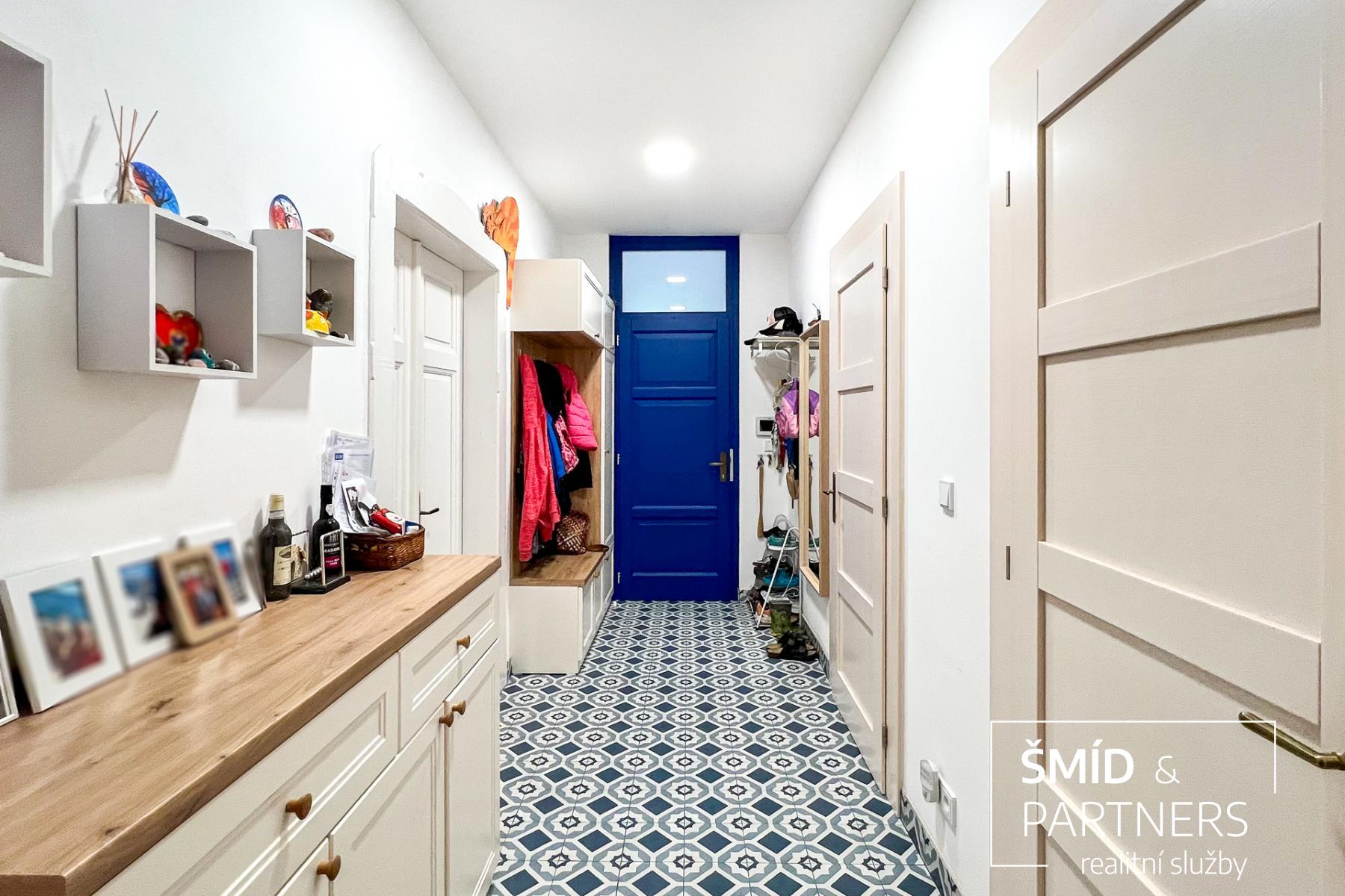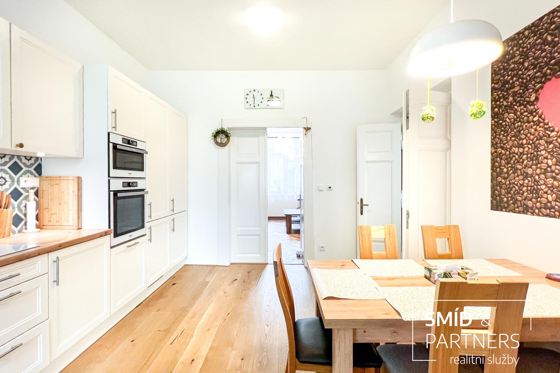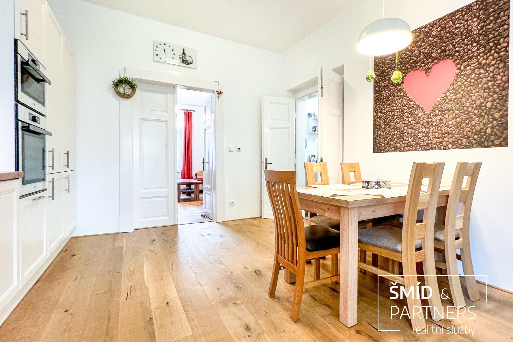 Tento byt má výhled jak do zahrady, která je stejně jako sauna k dispozici všem vlastníkům jednotek, tak do poklidné ulice. Byt je prostorný a díky velkým oknům a světlému interiéru příjemně prosluněný. Je zde jasně vidět spolupráce s architektkou, vznikl velice vkusný a praktický byt, kde je dětský pokoj, obývací pokoj, ložnice, krásná kuchyň, koupelna a WC. Nejčastěji používaný materiál je zde dřevo, vč. podlahové krytiny, díky tomu působí byt příjemným a teplým dojmem. Celkově byl při rekonstrukci domu kladen důraz na kvalitu použitých materiálů.