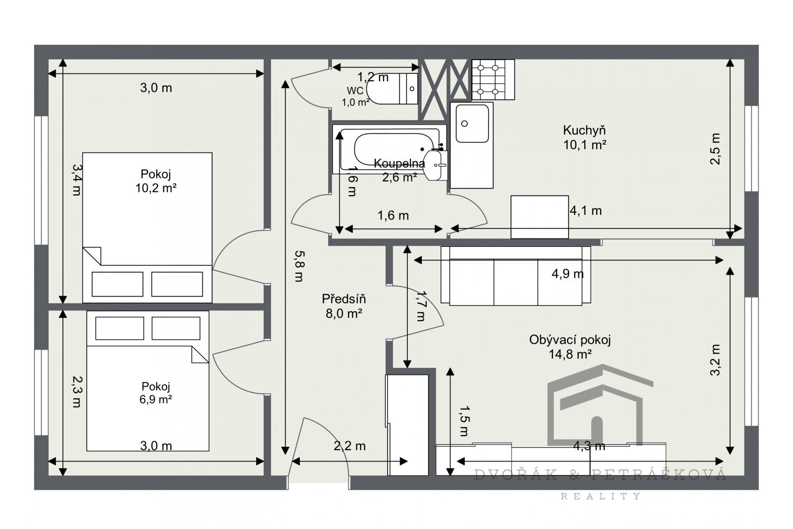 Realitní společnost Dvořák & Petrášková reality vám nabízí k prodeji byt v osobním vlastnictví 3+1 se sklepem a komorou na patře o celkové ploše 56 m2.