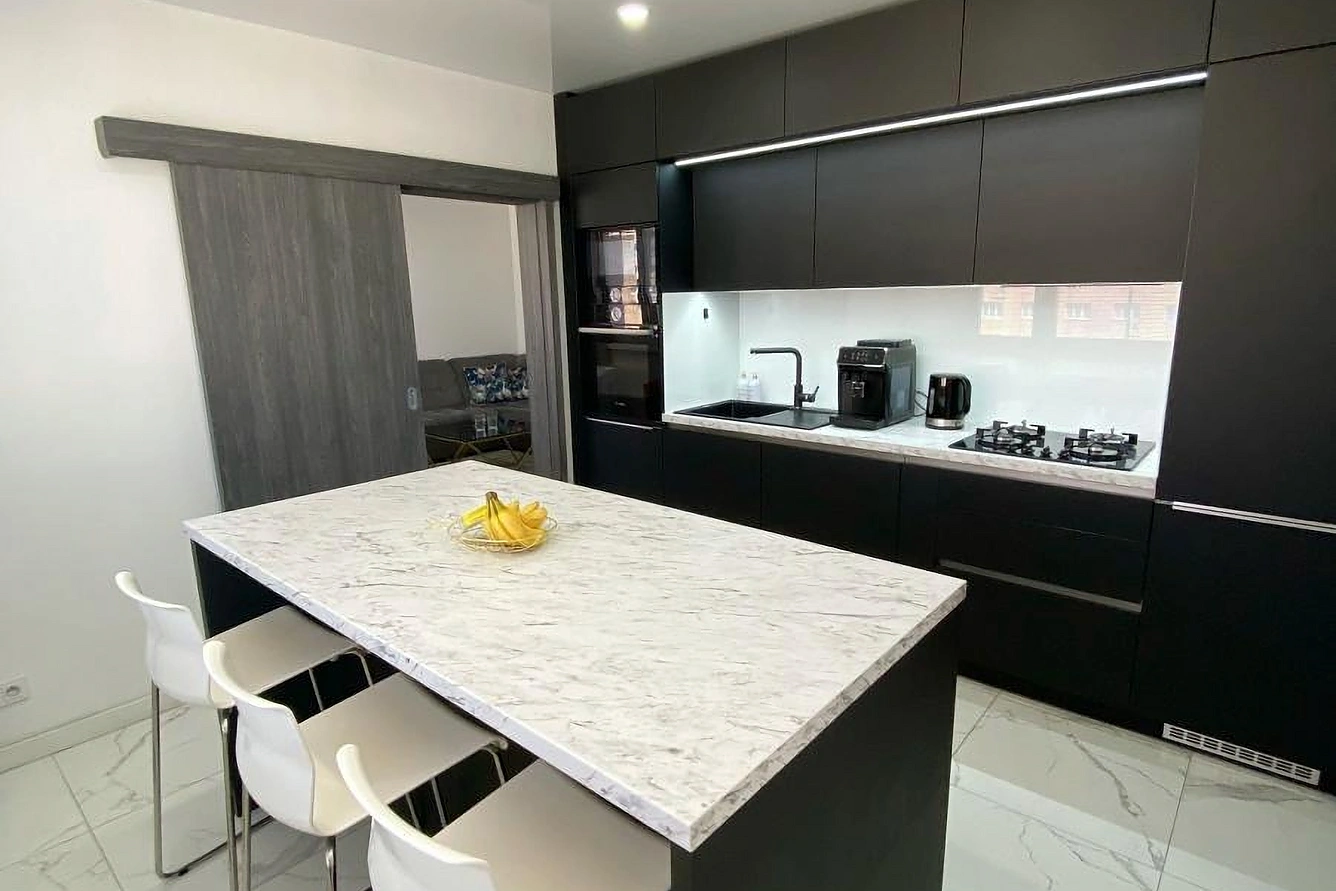 Byt je po kompletní rekonstrukci - Exkluzivní Kuchyň na míru od truhláře (nadstandartní 70cm hloubka) elektrický koš, doživotní Záruka na pojezdy Blum, myčka AEG, pračka LG, lednice, plynový sporák, vestavná trouba a mikrovlnka značky Bosch. Velkou předností je kuchyňský ostrůvek s posezením a úložný prostor. Exkluzivní koupelna nabídne keramickou dlažbu Italského výrobce, 2 umyvadla se skříňkou, zrcadlo s led podsvícením, zásuvku na fén a prostornou vanu značky Ravak se zástěnou ze skla. Wc Ideal Standard. Všechny baterie, sprcha, vestavný splachovací systém, háčky na ručníky jsou značky Grohe.