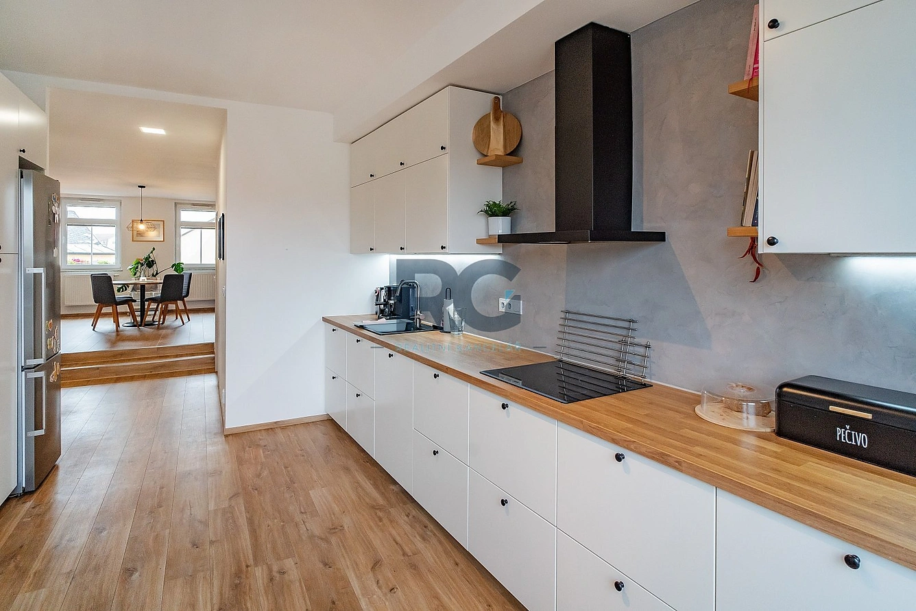 Exkluzivně nabízíme k prodeji nadstandardní mezonetový byt o dispozici 3+1 s balkonem. Byt o výměře podlahové plochy 134 m2 nabízí v dolní části světlý obývací prostor spojený s jídelnou, plně vybavenou kuchyni, předsíň a samostatnou toaletu; v patře se nachází dvě ložnice a koupelna s toaletou.