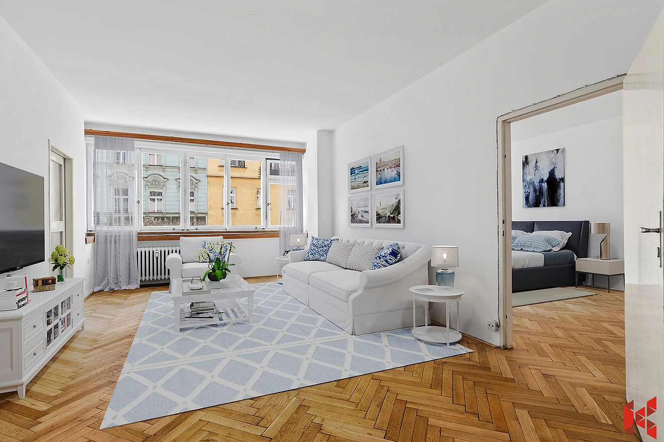 Tento světlý a prostorný byt okouzlí nejen milovníky prvorepublikové architektury, ale i každého, kdo hledá stylové bydlení s duší. Vysoké stropy, velkorysá vstupní hala, světlé místnosti, originální prvky a výhledy na pulzující městskou scenérii vytváří neopakovatelnou atmosféru.