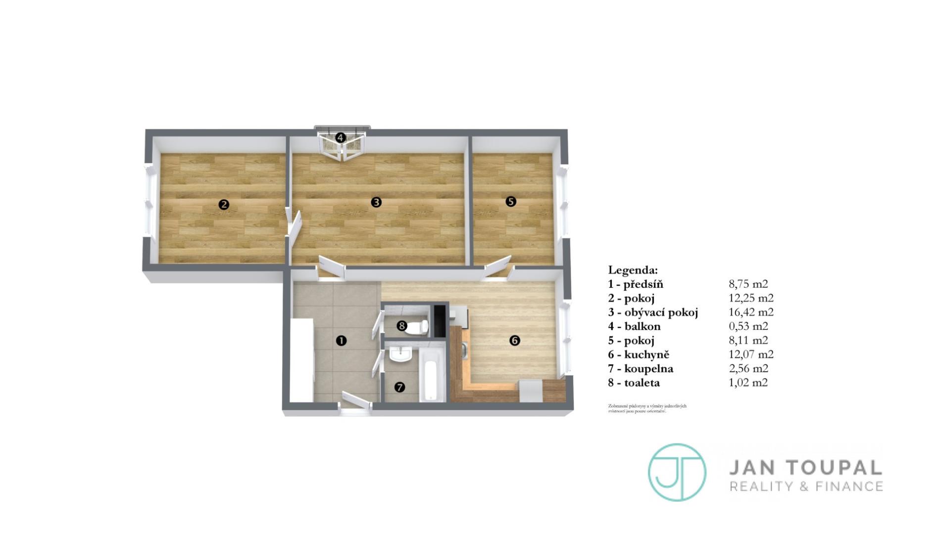 Dispozičně je byt velmi prakticky řešen. Centrální předsíň (8,75 m²) propojuje všechny místnosti – prostorný obývací pokoj (16,67 m²), dvě samostatné ložnice (12,25 m² a 8,11 m²), kuchyň (12,17 m²) s dostatkem místa pro jídelní kout, koupelnu (2,56 m²) a samostatné WC (1,10 m²). K bytu náleží také malý balkon (0,53 m²) a sklepní kóje o výměře 4,32 m², která se nachází v suterénu domu.