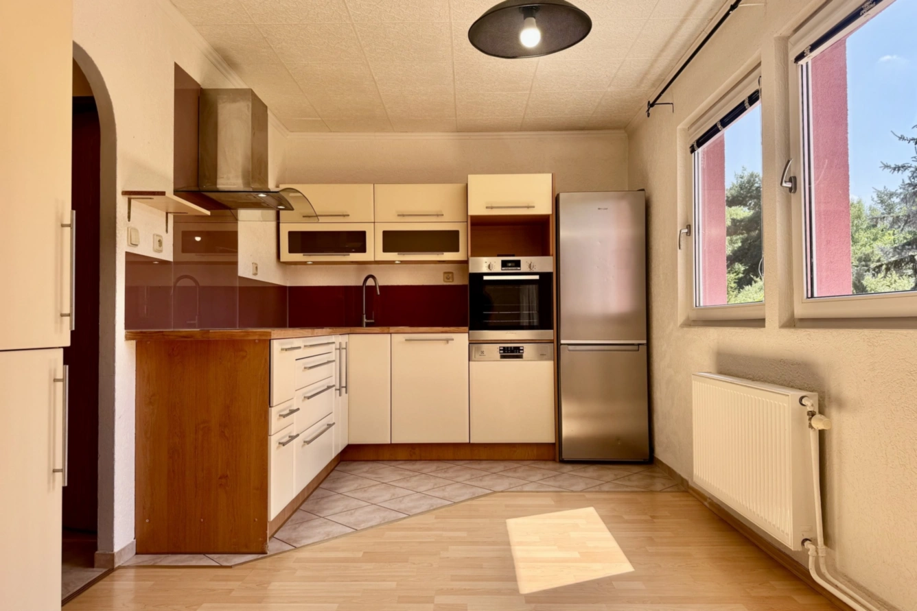 ?Dovoluji si Vám nabídnout k prodeji slunný byt v osobním vlastnictví o velikosti 3+1 s balkónem v Tachově, ul. Sládkova. ?Celková plocha bytu činí 82 m2. Jednotka se nachází v 1. patře dvoupatrového, bytového domu. Byt tvoří chodba, kuchyň s jídelním koutem, obývací pokoj se vstupem na balkón, dvě ložnice, koupelna s vanou a samostatné WC. Bytová jednotka prošla v letech 2002 - 2011 rekonstrukcí - komplet obložení místností sádrokartony, obklady v koupelně a WC, výměna oken, nová kuchyňská linka (2011). Rozvody elektřiny jsou již v mědi, voda a odpady jsou v plastu.V ceně je zahrnutá kuchyňská linka s vestavěnými spotřebiči (myčka, sklokeramická varná deska - indukce, digestoř, horkovzdušná trouba, lednice a vybavení bytu (viz. foto). Jednotka je vytápěna ústředně kondenzačním, plynovým kotlem (vlastní kotelna v bytovém domě pouze pro 4 byty, 5. jednotka je vytápěna samostatně), je zde zároveň společný splynovací kotel na tuhá paliva (uhlí, dřevo). Ohřev vody je zajištěn společným 1000 l boilerem pro celý bytový dům (4 bytové jednotky), plynovým kotlem, kotlem na tuhá paliva a zároveň solárními panely - umístěny na střeše). ??Ložnice jsou situovány na severní stranu, obývací pokoj s balkónem a kuchyň jsou situovány na jižní stranu.??K bytu náleží sklepní kóje, jsou zde zároveň společné prostory (sušárna, kolárna, a garáž).?Bytový dům má 5 bytových jednotek a byl postaven v roce 1990. Stavba je okálového typu: přízemí - panel, patra dřevotřískové panely. Vnější část fasády domu je po rekonstrukci (odstranění svrchních desek, nové zateplení a fasáda). Rekonstrukce fasády, osazení plynového kotle, plastových oken ve společných prostorech a solárních panelů byla provedena v roce 2011. ?Bytová jednotka je rovnou obyvatelná a je vhodná pro rodinu s dětmi hledající poklidné bydlení. Bytový dům se leží v klidné části města, bezproblémové parkování je možné před domem. Město Tachov nachází veškerou občanskou vybavenost. Koupi bytu je možné realizovat prostřednictvím hypotečního úvěru, který Vám zdarma zajistí naše společnost.