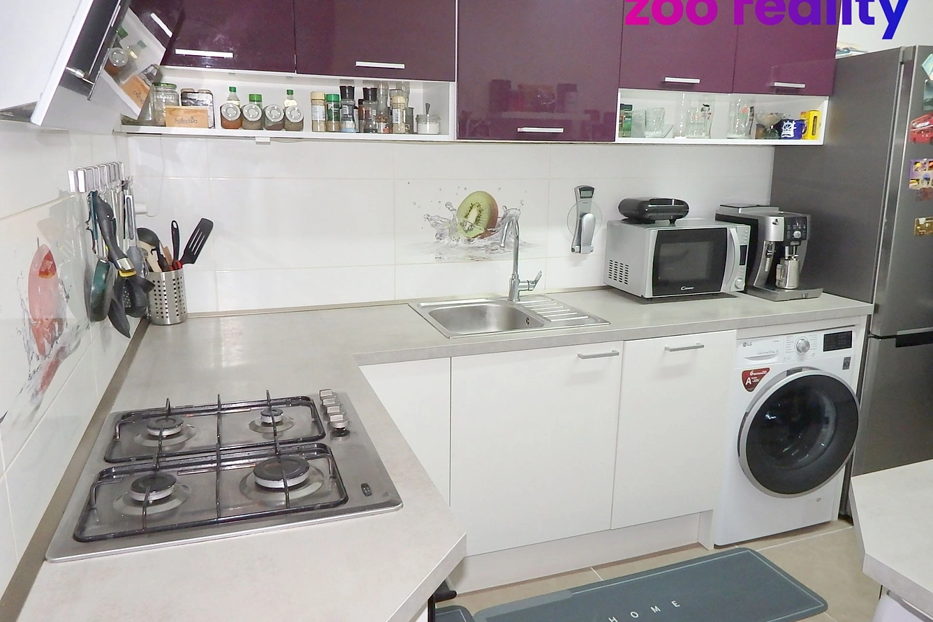 Byt se skládá z předsíně (9m2 podlahové plochy), obývacího pokoje (20m2 pp), kuchyně (10m2 pp), 2x ložnice po 12m2 pp, lodžie (6m2), koupelny a WC. K bytu patří komora na patře a sklep.