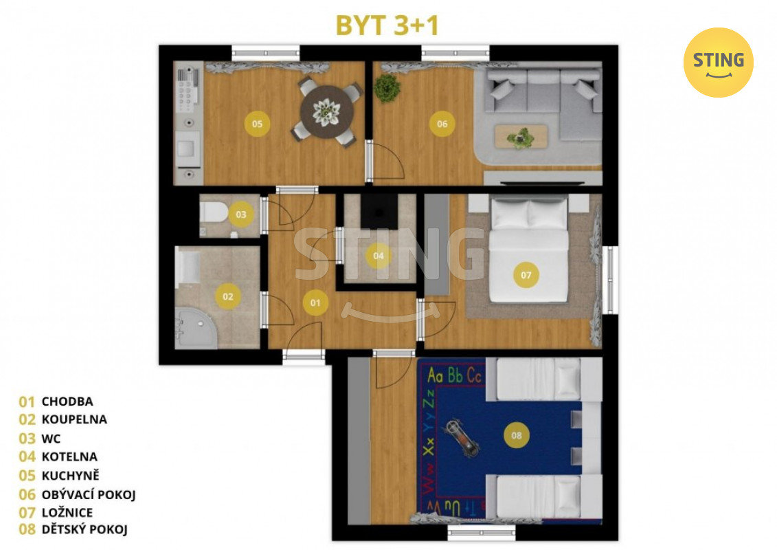 K bytu náleží také prostorný sklep, který poskytne dostatek úložného prostoru, sklad paliva či domácí dílnu.
