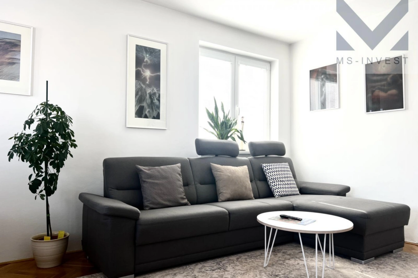 Citlivě zrekonstruovaný byt s původními prvky se nachází ve druhém patře domu s výtahem a má podlahovou plochu 83 m2. Je tvořen třemi pokoji (dva velkorysé a jeden menší používaný jako ložnice) a praktickou kuchyní s jídelním koutem a přístupem na balkon. Byt je velmi dobře dispozičně řešen, má luxusní koupelnu se sprchovým koutem, samostatné WC, šatnu s vestavěnými skříněmi, technickou místnost a spíž. V přízemí domu se nachází společná místnost pro kola a kočárky a sušárna na větší prádlo, v suterénu domu pak samostatný sklep patřící k bytu. Zcela unikátní vzhledem k poloze v centru města jsou oplocené zahrádky patřící k domu, kde mají vlastníci bytů záhony s dostatkem prostoru pro pěstování bylinek a zeleniny, u domu je i menší pískoviště a posezení.