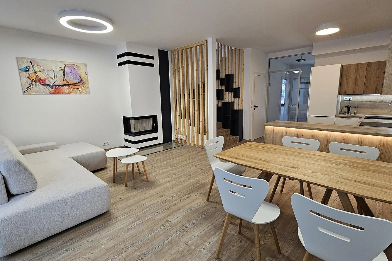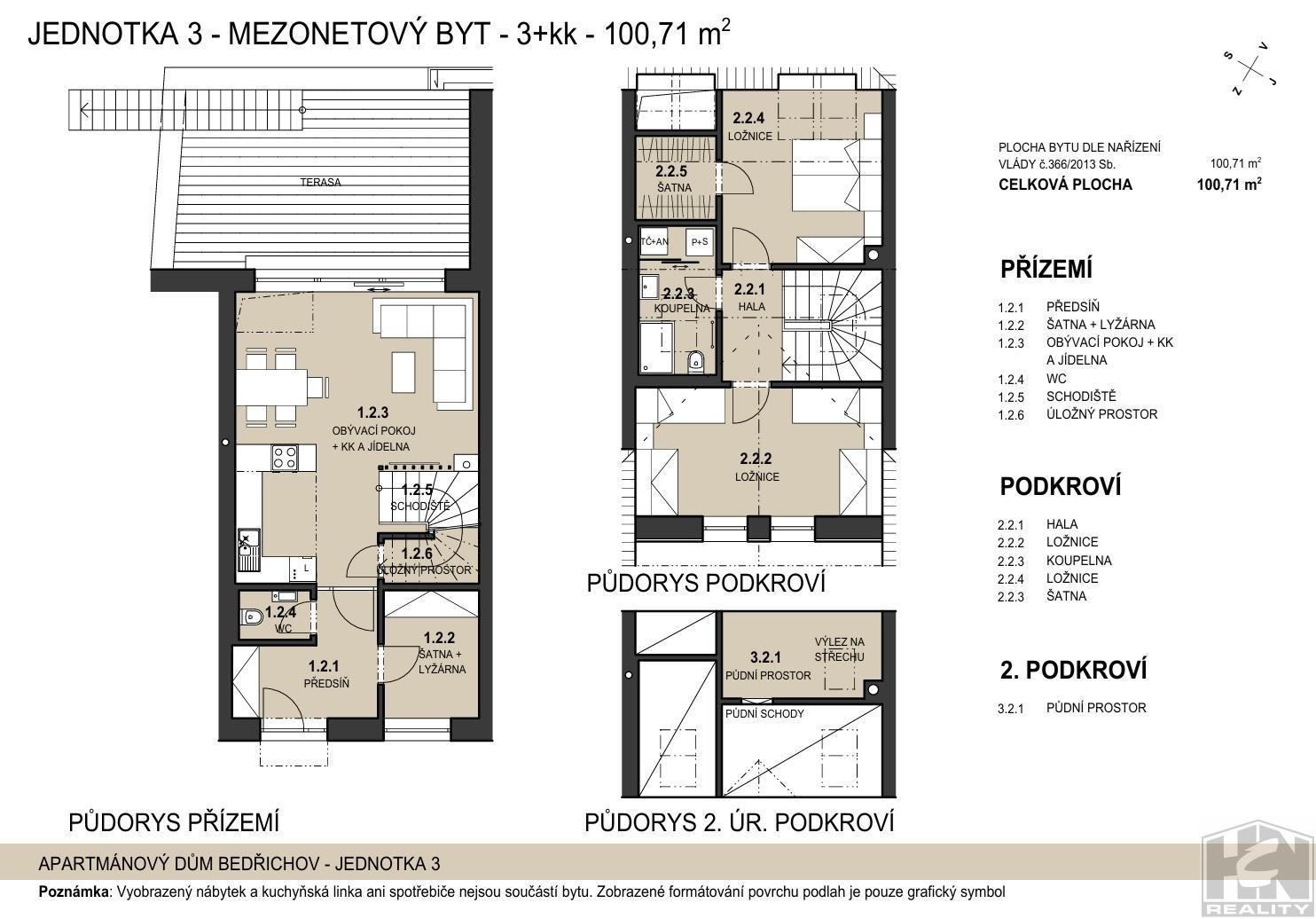 V tomto apartmánovém domě nabízíme mezonetovou jednotku k prodeji v dispozici 3+kk s celkovou plochou 133,42m2 z toho plocha bytu 100,71 m2 (plocha bytu dle nařízení vlády č.366/2013 Sb.) s terasou (25,9 m2) a s obytným půdním prostorem. Všechny apartmány obsahují v ceně jedno parkovací stání. Každý apartmán má úložný prostor pro kola nebo lyže.