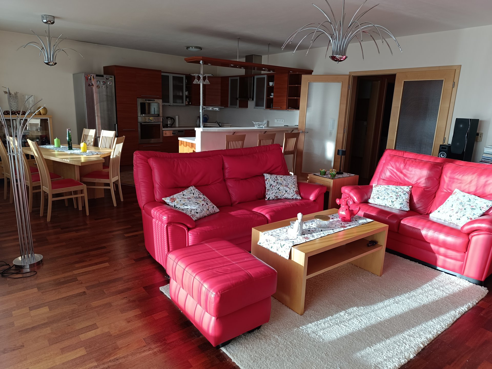 předsíň 11,7m2 vestavěnou skříní, šatna 2,7m2, pracovní či dětský pokoj 14,2m2 , ložnice 20,4m2, velkorysá koupelna s masážní vanou i sprchovým koutem 8,9m2, samostatné WC 1,9m2 a prostorný obývací pokoj s kuchyňskou linkou s vestavěnými spotřebiči 46,2m2.