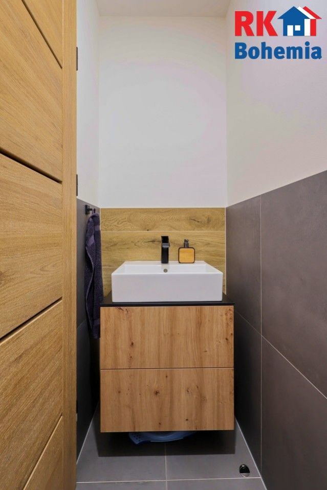 V koupelně se nachází sprchový kout s hydromasážním sprchovým panelem, umyvadlo, topný žebřík, vestavěná koupelnová skříň a příprava na pračku a sušičku.