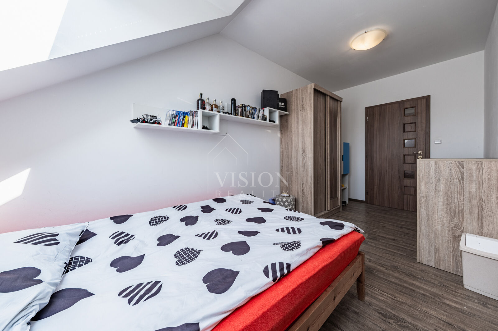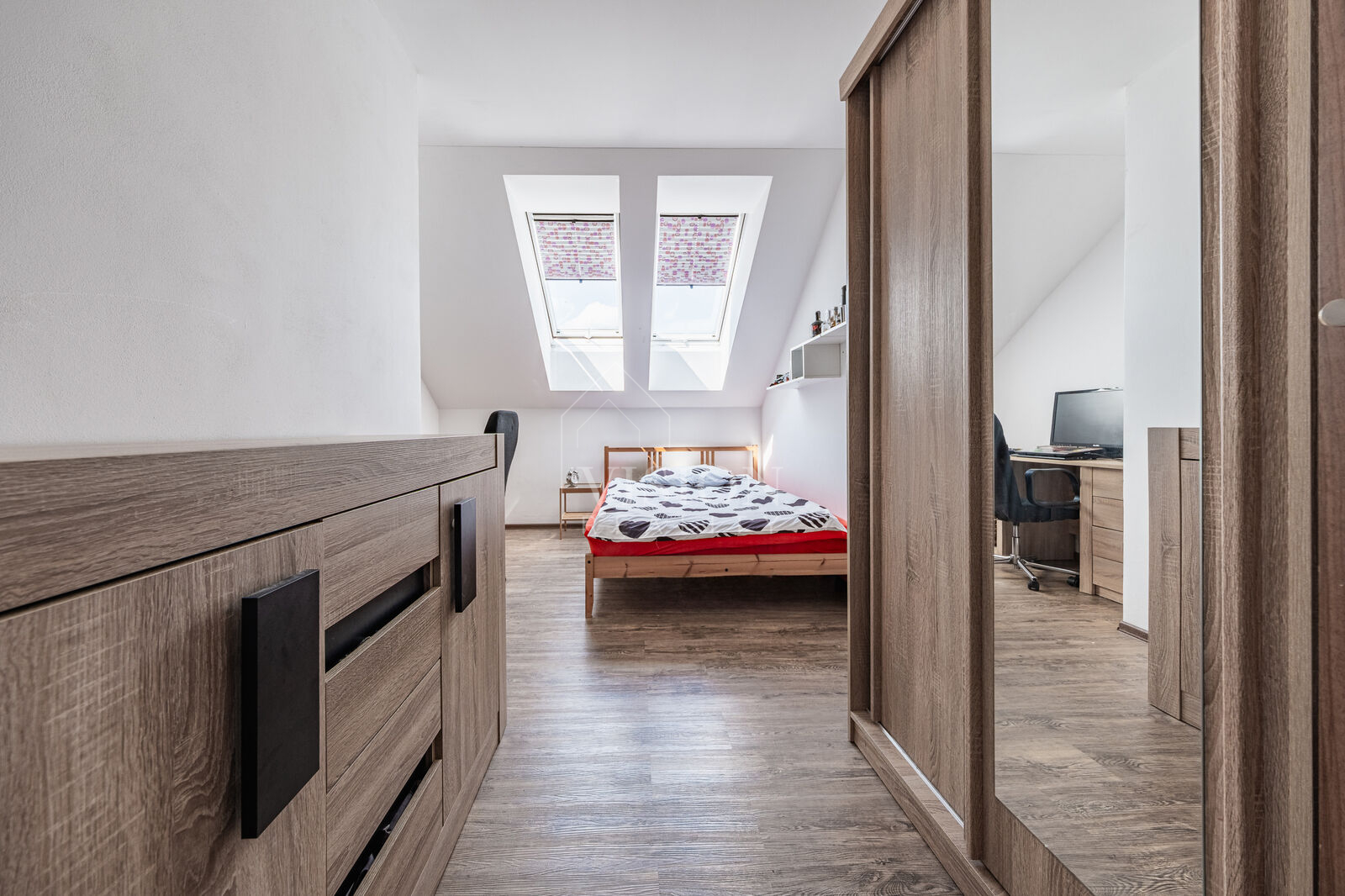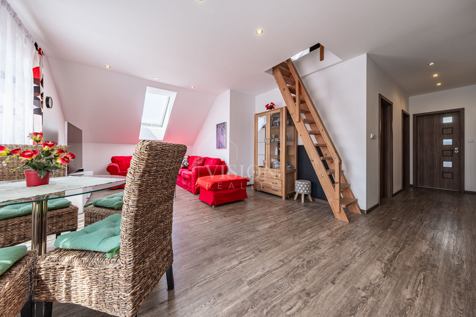 Byt je situován ve druhém a zároveň posledním podlaží bytového domu se čtyřmi jednotkami, což přispívá k nerušenému bydlení. Dispozice zahrnuje prostorný obývací pokoj s kuchyňským koutem a jídelní částí, dvě neprůchozí ložnice, koupelnu s vanou a sprchovým koutem, dále samostatné WC a schodiště do podkrovního prostoru, který lze využít jako hernu, pokoj pro hosty nebo jako úložnou zónu.