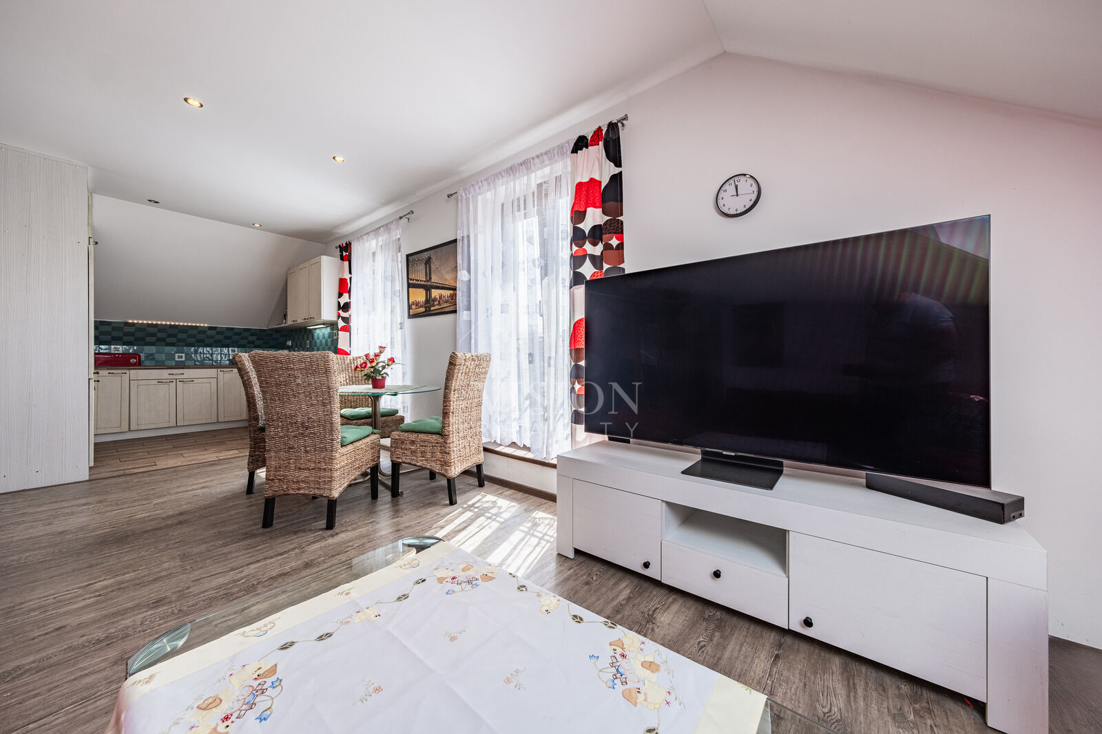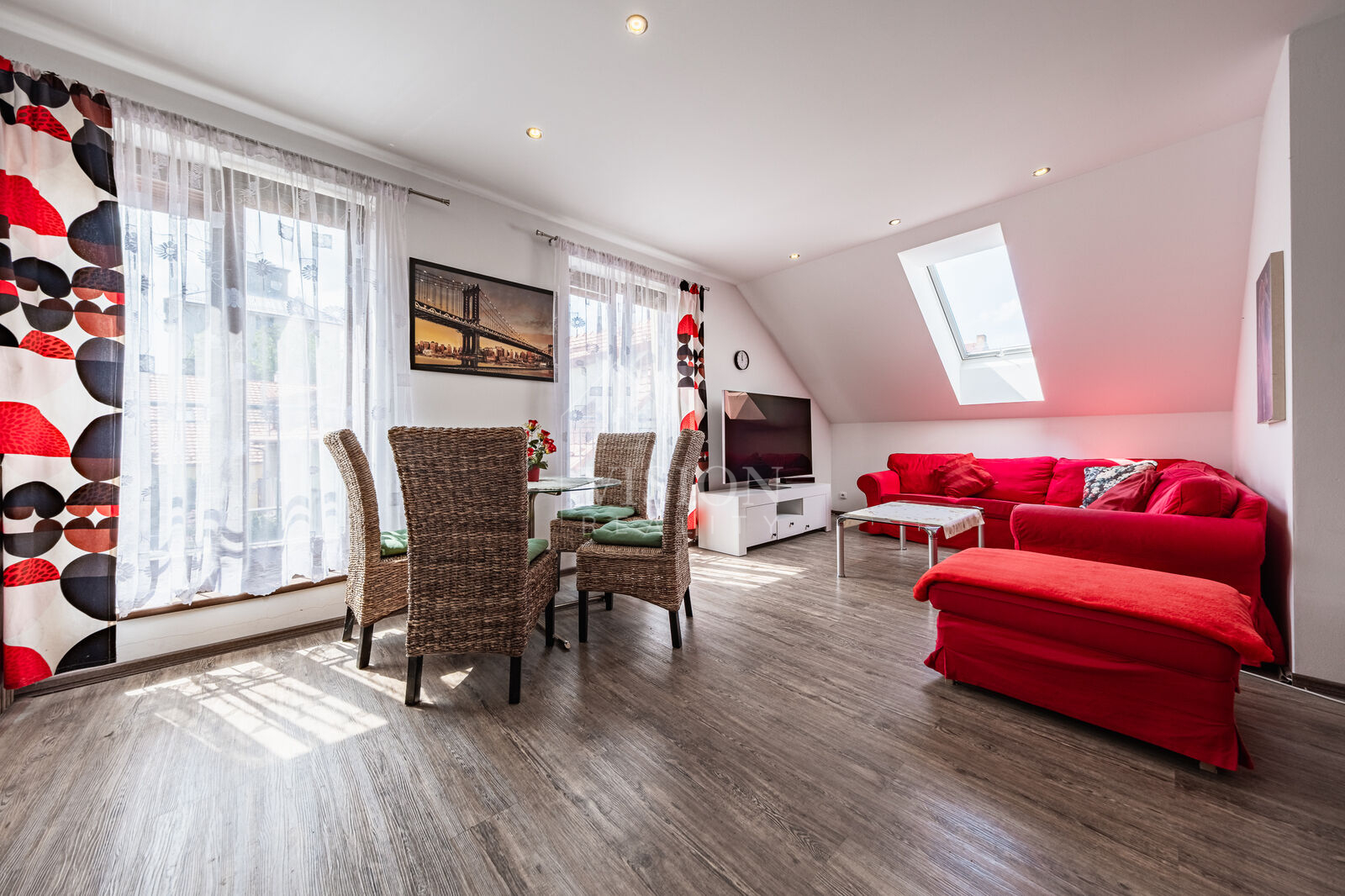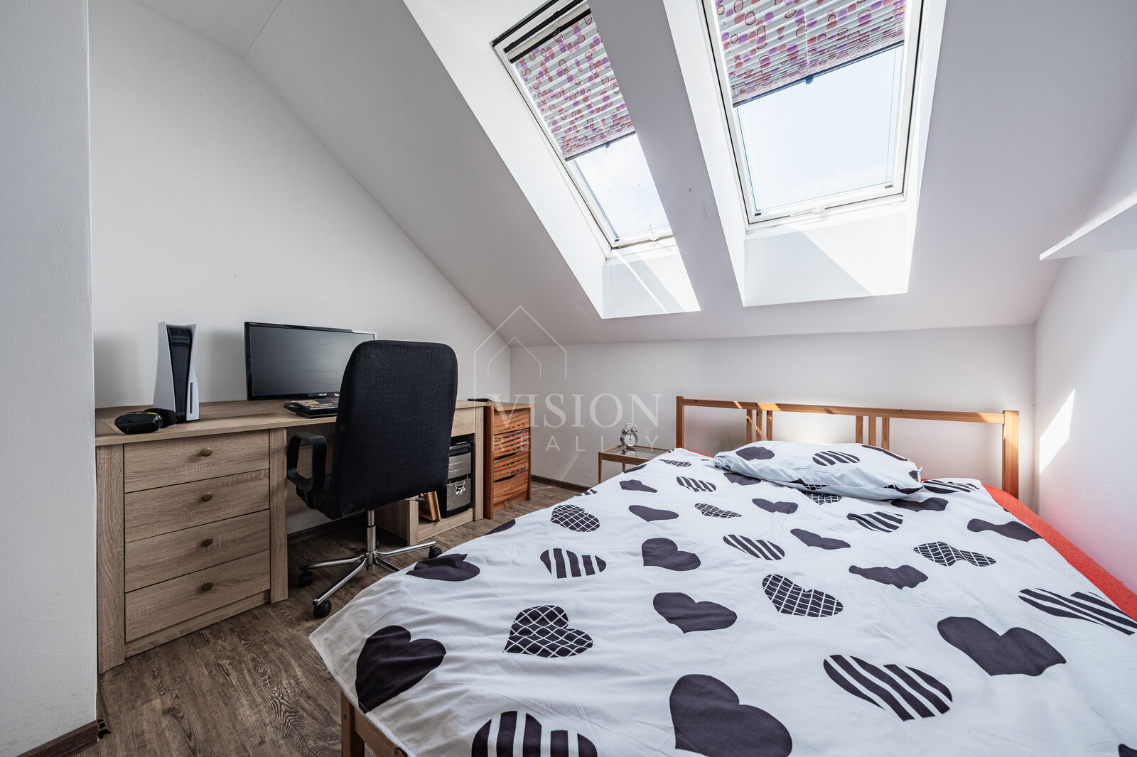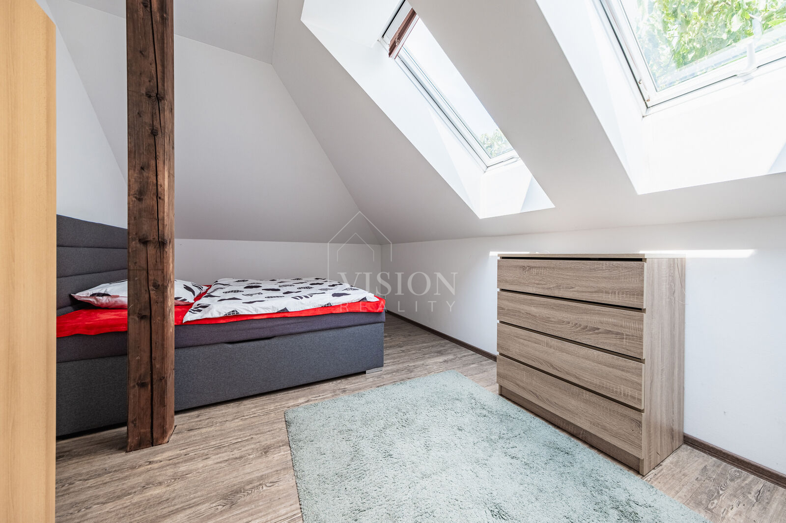Byt je situován ve druhém a zároveň posledním podlaží bytového domu se čtyřmi jednotkami, což přispívá k nerušenému bydlení. Dispozice zahrnuje prostorný obývací pokoj s kuchyňským koutem a jídelní částí, dvě neprůchozí ložnice, koupelnu s vanou a sprchovým koutem, dále samostatné WC a schodiště do podkrovního prostoru, který lze využít jako hernu, pokoj pro hosty nebo jako úložnou zónu.
